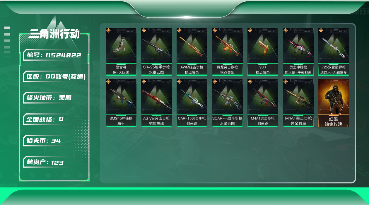 [11524822]总资产:123.1M 1干员外观 13传说枪械 哈夫币:34.777K 高级安全箱(2×3)9.15号到期 可二次 可修改实名 烽火地带段位:黑鹰 全面战场段位:上等兵 传说武器皮肤:AS Val突击步枪-蛇年祥瑞,SR-25射手步枪-水墨云图,SCAR-H战斗步枪-水墨云图,SMG45冲锋枪-骑士,M4A1突击步枪-阿米娅,CAR-15突击步枪-阿米娅,复合弓-黑-天际线,AWM狙击步枪-捞点薯条,腾龙突击步枪-捞点薯条,93R-捞点薯条,勇士冲锋枪-能天使-午夜邮差,725双管霰弹枪-送葬人-无题密令,M4A1突击步枪-蚀金玫瑰 干员外观:红狼-蚀金玫瑰