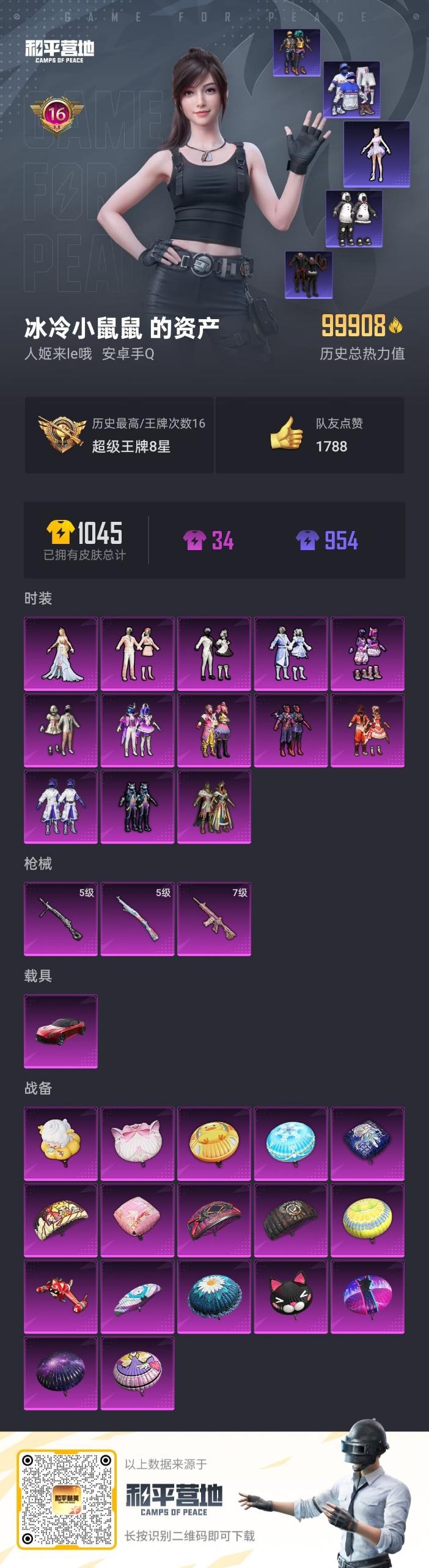 - PX_2095263- 可二次 安卓手Q-7王牌印记-3粉装-9特效枪-0载具-46441热力值-104套装-157枪皮-5卓越印记-2传奇印记, 【3粉装】,智耀战神,荧海星豚,烟云彩露, 【9特效枪】,M416-电玩时刻-5级,GROZA-镜光银凌-5级,AUG-暖羊咩咩-5级,M762-青锋波束-5级,蜜獾-荧海星豚-4级,Kar98K-巳巳如意-5级,Mk14-甜梦熊击-5级,UMP45-