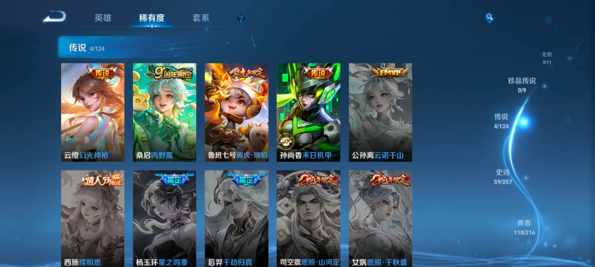 - PX_2094846-安卓Q 【可二次】 英雄数量:125 皮肤数量:271 贵族等级:贵族V8 无双限定1 荣耀典藏1 珍品传说1 传说品质22 史诗品质67器灵·螭龙剑 星域神启 朽木白哉 李逍遥 白虎志 祈雪灵祝 诗剑行 无双飞将 淬星耀世 祥瑞亨通 愿照·九州拓 齐天大圣 久胜战神 武圣 炽阳神光 冠军飞将 启明星使 地狱之眼 超时空战士男 鸣野蒿 逐花归海 落雪白狼 战鼓燎原 鹤羽星尊