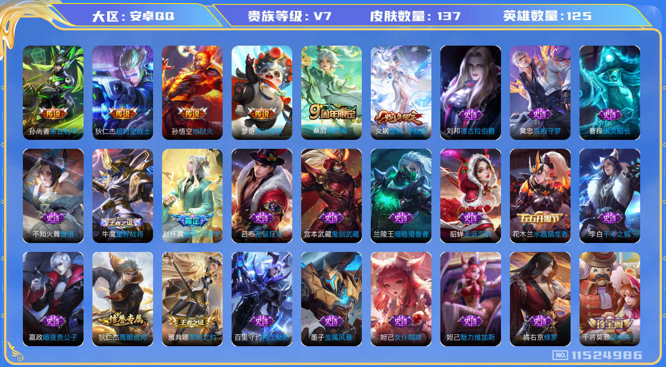 [11524986]V7 6传说 125英雄 137皮肤 可修改实名 优质装备:末日机甲-孙尚香(绿蚂蚱),地狱火,胖达荣荣,超时空战士-狄仁杰 珍宝阁皮:胡桃夹子 限定皮:愿照·千秋盛(女娲年限),鸣野蒿 史诗皮:器灵·浮梦炉,星界战将,百相守梦-黄忠,特工魅影,千年之狐,魅语,修罗,女仆咖啡,德古拉伯爵,暗隐猎兽者,幽灵船长,鬼剑武藏,水晶猎龙者,金属风暴,圣诞狂欢,圣诞恋歌,鹰眼统帅,暗夜贵公子,魅力维加斯,黎明之约