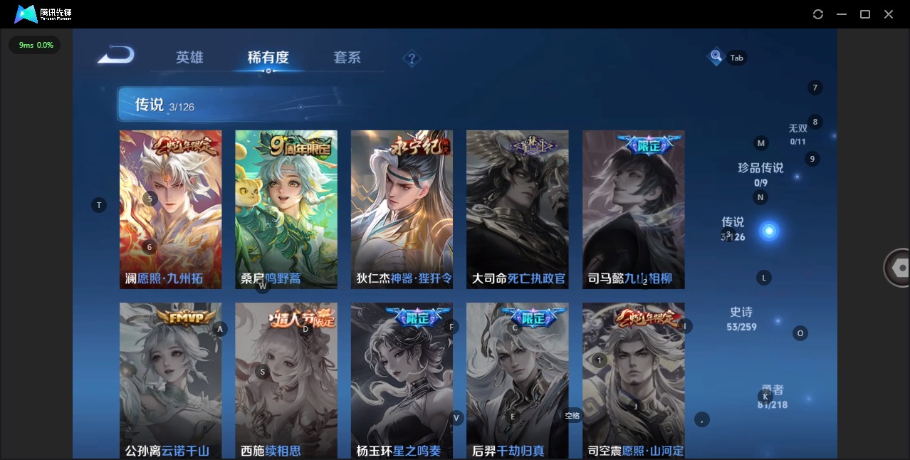 - [12166499]V5 3传说 38英雄 38皮肤 可修改实名 优质装备:绛天战甲(鸡嘴战神),炽阳神光,涂山容容 传说皮:九山相柳 限定皮:时之奇旅-妲己 史诗皮:龙之律动,百相守梦-周瑜,百相守梦-黄忠,冰冠公主,无限星赏官,时之恋人-孙尚香,鬼剑武藏,暗渊魔法,鹰眼统帅,魅力维加斯