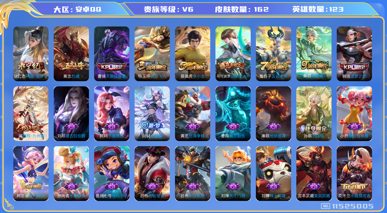 [11525005]V6 3传说 123英雄 162皮肤 可修改实名 优质装备:神器·狴犴令 珍宝阁皮:蔷薇恋人,玩趣恶龙 限定皮:愿照·九州拓(澜年限),鸣野蒿,遇见飞天,五谷丰年,烈魂,天狼征服者,李小龙,逐梦之影,山海·玄木吟(马可年限) 史诗皮:化蝶舞,龙之律动,雪豹·霜爪,茶境仙,怒海争锋,电玩小子(小书包),特工魅影,江河有灵,蒙恬荣光圣徽,偶像歌手,末日机甲-吕布,节奏热浪,摇滚巨星,水果甜心,绅士熊喵,天才门将,星夜王子,心灵骇客,功夫厨神,德古拉伯爵,幽灵船长,鬼剑武藏,心灵战警,地狱岩魂,缤纷独角兽,逐浪之夏,水晶猎龙者,金属风暴,原初追逐者,圣诞狂欢,鹰眼统帅,魅力维加斯,黎明之约,未来纪元-赵云