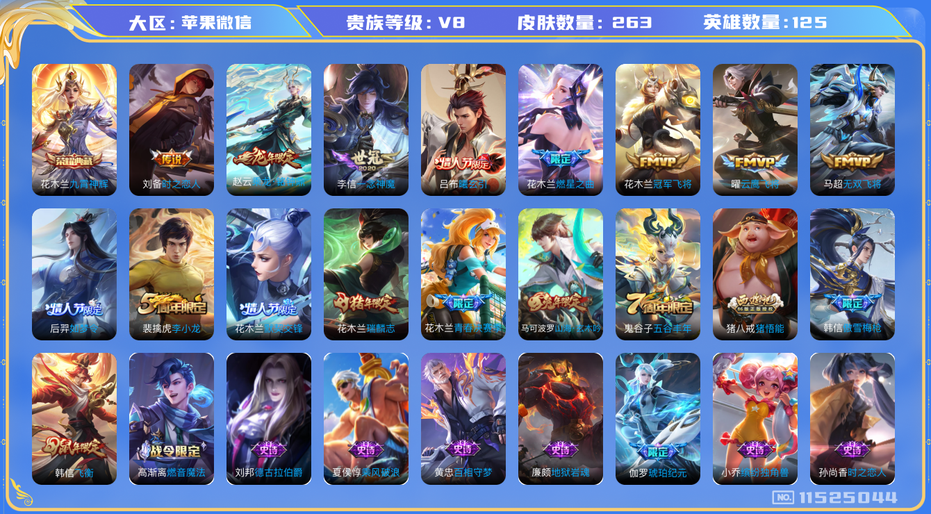 [11525044]V8 1典藏 9传说 123英雄 253皮肤 可修改实名 荣耀水晶:九霄神辉(木兰典藏) 传说皮:乘龙·铭钟鼎(赵云年限),吕布曦玄引,一念神魔,冠军飞将,云鹰飞将(小将军),无双飞将,时之恋人-刘备(电焊工),燃星之曲 珍宝阁皮:蔷薇恋人,女武神 限定皮:傲雪梅枪,飞衡(韩信年限),瑞麟志(木兰年限),五谷丰年,李小龙,如梦令-后羿,默契交锋-花木兰,猪悟能,青春决赛季,山海·玄木吟(马可年限) 史诗皮:百相守梦-黄忠,蔬乡物语(鲁班七号),超元猎域,琥珀纪元伽罗,苍穹之光,电玩小子(小书包),黄金分割率,特工魅影,永昼,江河有灵,高渐离燃音魔法,百解令(蒙犽),蒙恬荣光圣徽,冰冠公主,偶像歌手,晚萤,无限星赏官,电玩·爆裂旋风,龙骑士(小龙虾),末日机甲-吕布,猫狗日记-孙策,时之恋人-孙尚香,修罗,水果甜心,绅士熊喵,星夜王子,功夫厨神,德古拉伯爵,暗隐猎兽者,鬼剑武藏,心灵战警,繁星吟游(呼啦呼啦),拒霜思,缤纷独角兽,乘风破浪,逐浪之夏,水晶猎龙者,金属风暴,原初追逐者,圣诞狂欢,圣诞恋歌,鹰眼统帅,魅力维加斯,黎明之约,赏金猎手,奇遇舞章,千筹问战,无心