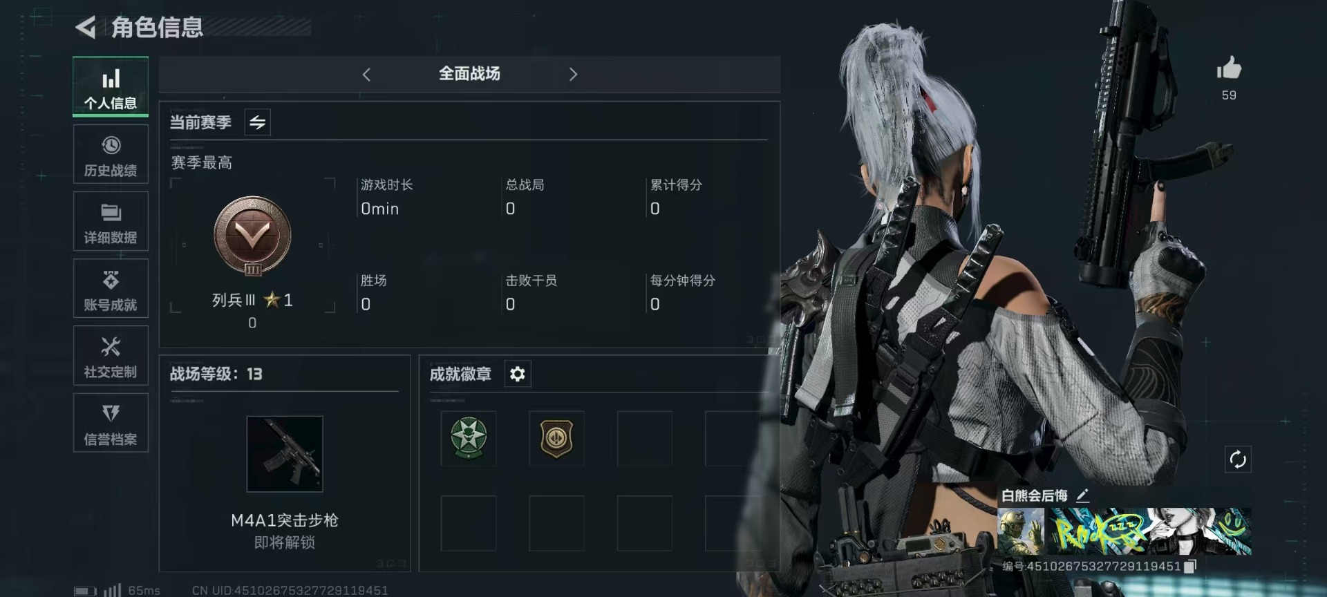 - PX_2078017-时装数: 68 枪械数: 86 战备数: 79 热门装扮: 月影灵韵 稀有枪皮: Kar98K-巳巳如意
