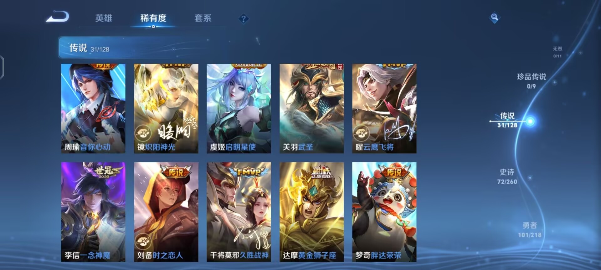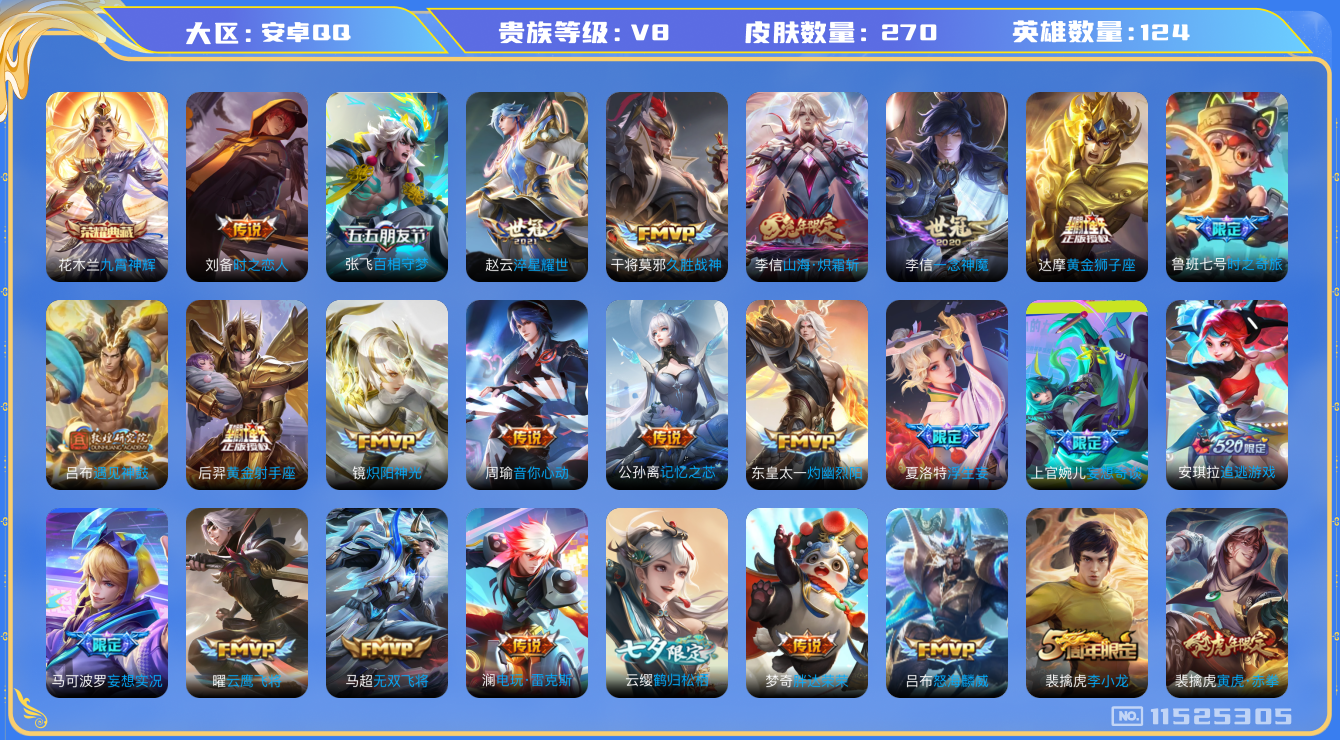 [11525305]V8 1典藏 31传说 124英雄 270皮肤 可修改实名 优质装备:九霄神辉(木兰典藏),黄金狮子座,黄金射手座,云鹰飞将(小将军),久胜战神,炽阳神光,一念神魔,音你心动-周瑜,胖达荣荣,时之恋人-刘备(电焊工),淬星耀世,无双飞将,山海·炽霜斩(李信年限),浮生妄,记忆之芯(机甲兔),百相守梦(张飞),追逃游戏(安琪拉),电玩·雷克斯,灼幽烈阳,妄想实况,妄想奇谈,鹤归松栖(云缨),遇见神鼓,鲁班七号-时之奇旅 珍宝阁皮:妄想食味 限定皮:鸣野蒿,至尊宝,傲雪梅枪,山海·碧波行(瑶年限),诗剑行,齐天大圣,怒海麟威,武圣,李小龙,默契交锋-花木兰,引擎之心,寅虎·赤拳(老虎年限),深海之息(深海大菠萝),山海·玄木吟(马可年限) 史诗皮:鸭鸭历险记-刘禅,星界战将,谪仙醉月,龙之律动,破空之剑,蒙犽顽岩魄,乘龙·聚宝船(安琪拉年限),百相守梦-黄忠,织梦人,紫霞仙子,特工魅影,永昼,江河有灵,匿光侦查者,鹤归松栖(赵怀真),高渐离燃音魔法,蒙恬荣光圣徽,匿光破解者,冰冠公主,电玩·爆裂旋风,百相守梦(刘备),暗夜猫娘,银翎春语,末日机甲-吕布,猫狗日记-孙策,时之恋人-孙尚香,修罗,女仆咖啡,摇滚巨星,水果甜心,天才门将,功夫厨神,德古拉伯爵,暗隐猎兽者,幽灵船长,鬼剑武藏,暗渊魔法,心灵战警,天秀·启明,纤云弄巧,缤纷独角兽,逐浪之夏,水晶猎龙者,曙光守护者,箭羽风息,唤灵魅影,金属风暴,原初追逐者,圣诞恋歌,鹰眼统帅,魅力维加斯,赏金猎手,天秀·音浪,无心,玫瑰异探