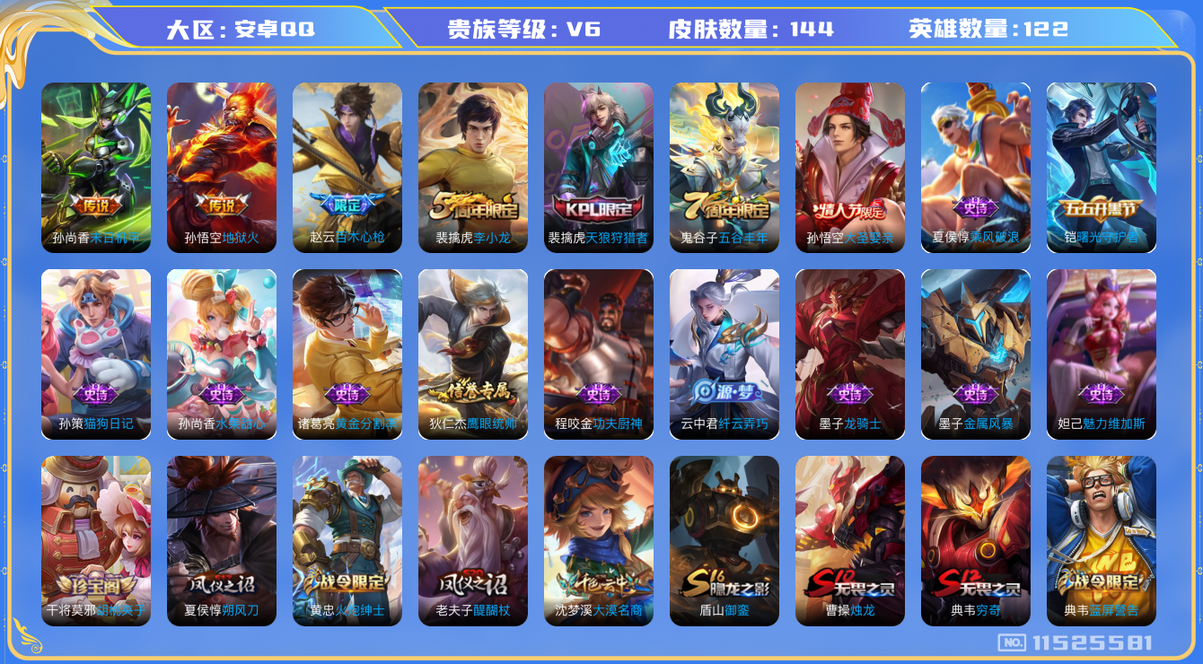 [11525581]V6 2传说 122英雄 144皮肤 可修改实名 优质装备:末日机甲-孙尚香(绿蚂蚱),地狱火 珍宝阁皮:胡桃夹子 限定皮:五谷丰年,天狼狩猎者,李小龙,大圣娶亲,百木心枪 史诗皮:黄金分割率,龙骑士(小龙虾),猫狗日记-孙策,水果甜心,功夫厨神,纤云弄巧,乘风破浪,曙光守护者,金属风暴,鹰眼统帅,魅力维加斯