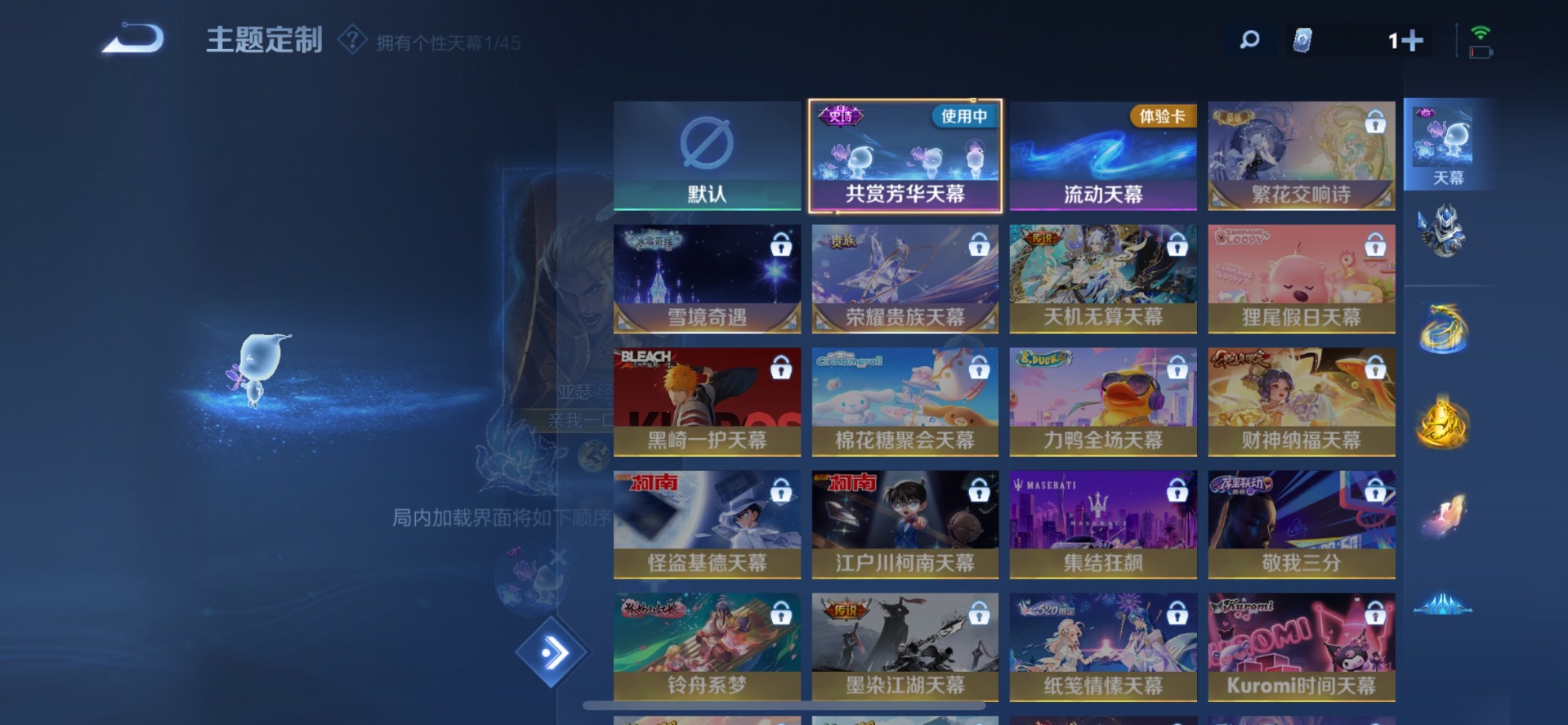 刘邦德古拉伯爵,夏侯惇乘风破浪,阿轲暗夜猫娘,阿轲节奏热浪,曹操幽灵船长,廉颇地狱岩魂,小乔缤纷独角兽,孙策猫狗日记,不知火舞魅语,鲁班七号电玩小子,项羽苍穹之光,吕布圣诞狂欢,诸葛亮黄金分割率,宫本武藏鬼剑武藏,兰陵王暗隐猎兽者,貂蝉圣诞恋歌,花木兰水晶猎龙者,夏洛特永昼,李白千年之狐,安琪拉心灵骇客,安琪拉时之奇旅,艾琳奇遇舞章,白起星夜王子,西施诗语江南,亚瑟心灵战警,张良千筹问战,嬴政暗夜贵公子,程咬金功夫厨神,百里玄策原初追逐者,雅典娜黎明之约,百里守约特工魅影,李元芳逐浪之夏,墨子龙骑士,墨子金属风暴,蔡文姬舞动绿茵,瑶遇见神鹿,娜可露露晚萤,王昭君偶像歌手,嫦娥拒霜思,橘右京修罗
