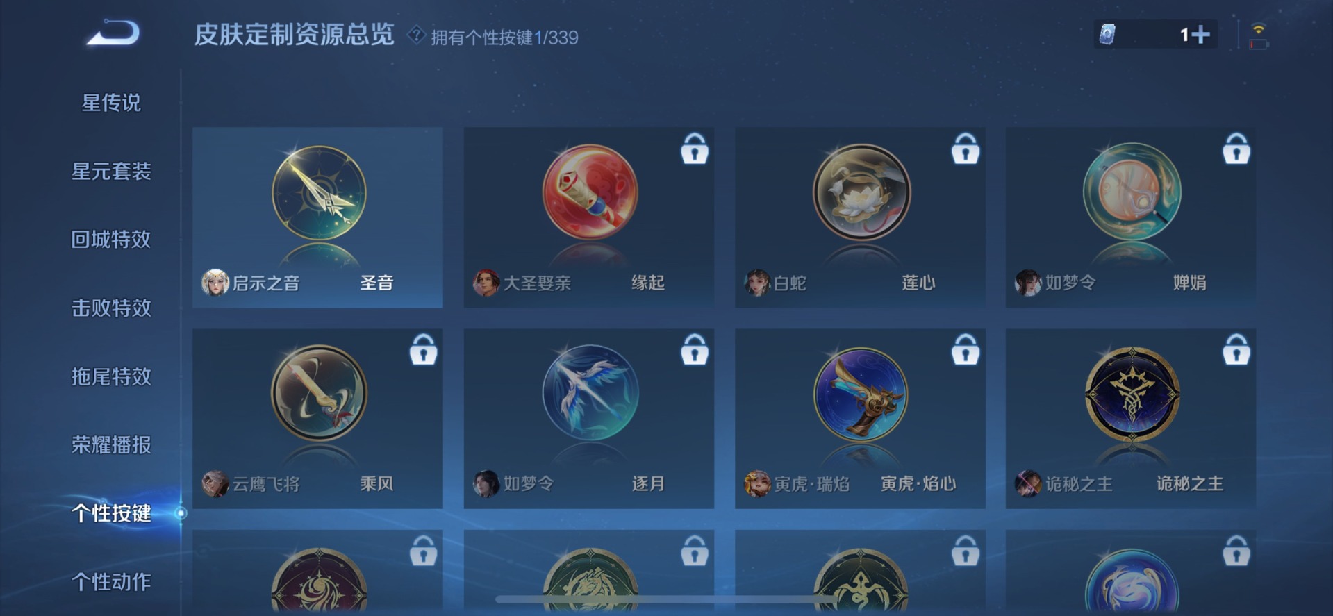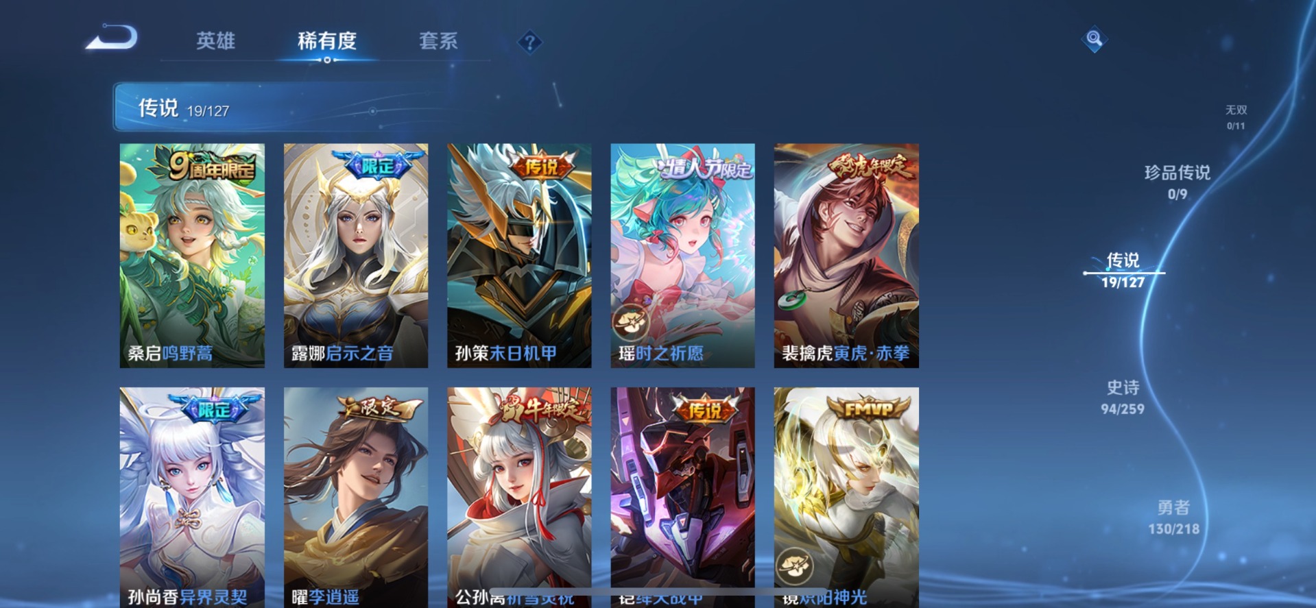 金蝉唐三藏,伽罗太华,赵云龙胆,干将莫邪冰霜恋舞曲,孙尚香异界灵契,牛魔奔雷神使,后羿如梦令,露娜启示之音,露娜一生所爱,公孙离祈雪灵祝,裴擒虎李小龙,裴擒虎寅虎·赤拳,东皇太一逐梦之光,上官婉儿梁祝,上官婉儿天狼绘梦者,花木兰瑞麟志,花木兰青春决赛季,桑启鸣野蒿,猪八戒猪悟能,孙悟空大圣娶亲,孙悟空至尊宝,百里玄策白虎志,马超神威,赵云引擎之心,韩信傲雪梅枪,蔡文姬奇迹圣诞,瑶时之祈愿,妲己热情桑巴,嫦娥如梦令,关羽冰锋战神