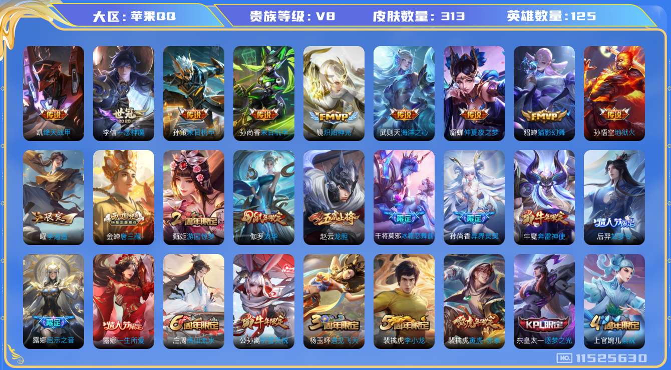 - [11297169]V8 1典藏 13传说 125英雄 305皮肤 可修改实名 优质装备:神鉴启示录,炽阳神光,末日机甲-孙尚香(绿蚂蚱),地狱火,记忆之芯(机甲兔),妄想实况,琥珀纪元马超 传说皮:幻光神枪 珍宝阁皮:优雅恋人,蔷薇恋人,女武神 限定皮:鸣野蒿,至尊宝,白虎志(电光耗子),凤求凰(白切鸡),时雨天司(水龙头),神威(电光马子),飞衡(韩信年限),遇见飞天,五谷丰年,冰锋战神,游园惊梦,梁祝,御风骁将(吕布年限),逐梦之星,天狼溯光者,逐梦之音,李小龙,逐梦之影,默契交锋-花木兰,一生所爱,大圣娶亲,青春决赛季,冰霜恋舞曲,深海之息(深海大菠萝),山海·玄木吟(马可年限) 史诗皮:化蝶舞,星界战将,石田雨龙,紫霞仙子,电玩小子(小书包),白龙吟,黄金分割率,特工魅影,千年之狐,末日机甲-莱西奥,江河有灵,百解令(蒙犽),蒙恬荣光圣徽,偶像歌手,龙骑士(小龙虾),魅语,无限星赏官,晚萤,末日机甲-吕布,猫狗日记-孙策,猫狗日记-大乔,乱世虎臣,节奏热浪,修罗,女仆咖啡,水果甜心,天才门将,星夜王子,功夫厨神,德古拉伯爵,暗隐猎兽者,幽灵船长,鬼剑武藏,天秀·启明,舞动绿茵,地狱岩魂,纤云弄巧,繁星吟游(呼啦呼啦),拒霜思,缤纷独角兽,乘风破浪,逐浪之夏,龙鼓争鸣,水晶猎龙者,曙光守护者,金属风暴,原初追逐者,圣诞狂欢,圣诞恋歌,鹰眼统帅,魅力维加斯,黎明之约,赏金猎手,无心