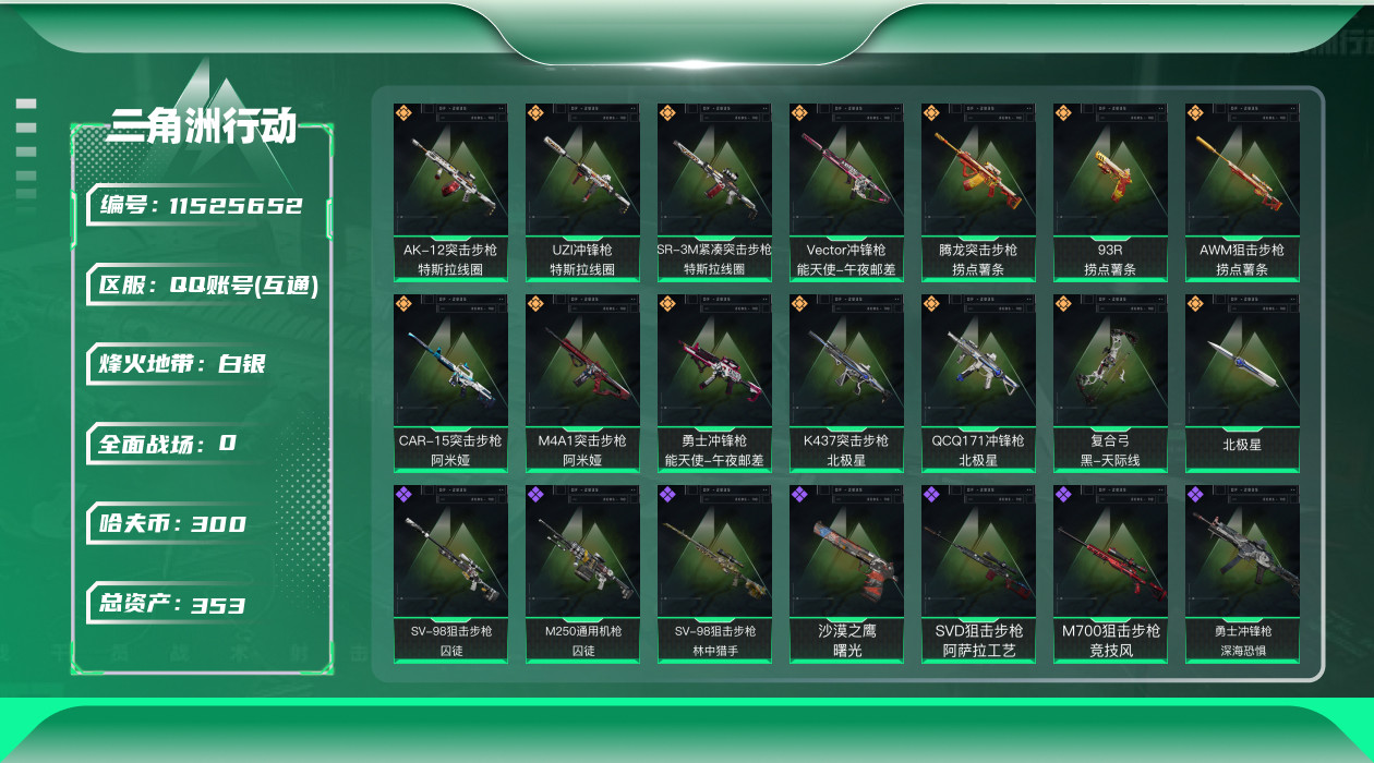 [11525652]总资产:353.2M 1干员外观 1近战传说 14传说枪械 哈夫币:300K 可二次 可修改实名 优质装备:近战-北极星,顶级安全箱(3x3) 烽火地带段位:白银 全面战场段位:列兵 传说武器皮肤:M4A1突击步枪-阿米娅,CAR-15突击步枪-阿米娅,复合弓-黑-天际线,AWM狙击步枪-捞点薯条,QCQ171冲锋枪-北极星,腾龙突击步枪-捞点薯条,93R-捞点薯条,AK-12突击步枪-特斯拉线圈,SR-3M紧凑突击步枪-特斯拉线圈,UZI冲锋枪-特斯拉线圈,勇士冲锋枪-能天使-午夜邮差,K437突击步枪-北极星,Vector冲锋枪-能天使-午夜邮差 史诗武器皮肤:勇士冲锋枪-深海恐惧,SG552突击步枪-深海恐惧,AKM突击步枪-林中猎手,M1014霰弹枪-林中猎手,SV-98狙击步枪-林中猎手,PTR-32突击步枪-英雄,M250通用机枪-囚徒,SV-98狙击步枪-囚徒,沙漠之鹰-曙光,SVD狙击步枪-阿萨拉工艺,M700狙击步枪-竞技风 干员外观:露娜-黑·天际线