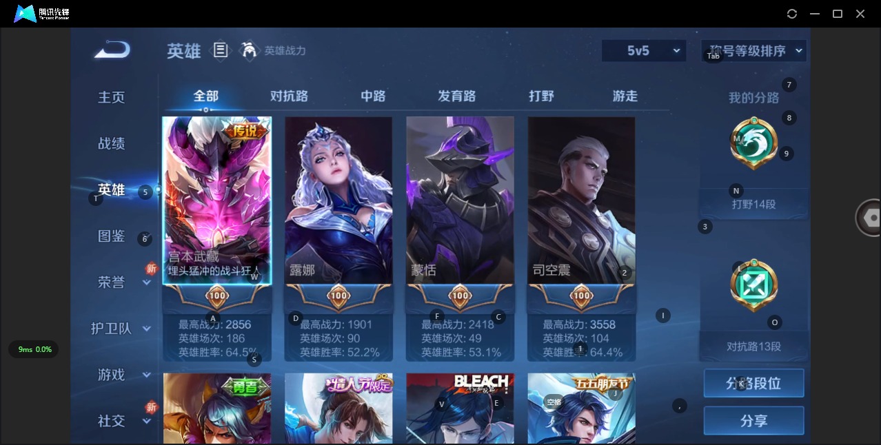 - PX_2095029-实名: 可修改 贵族等级: V4 英雄数: 105 皮肤数: 74 传说皮: 记忆之芯 限定皮: 游园惊梦,鸣野蒿