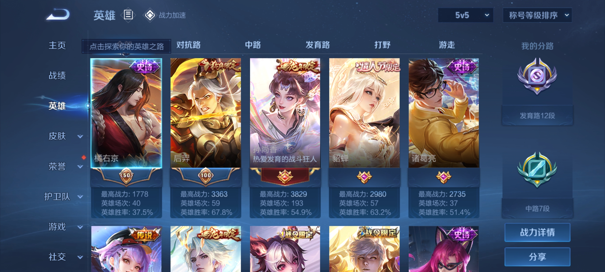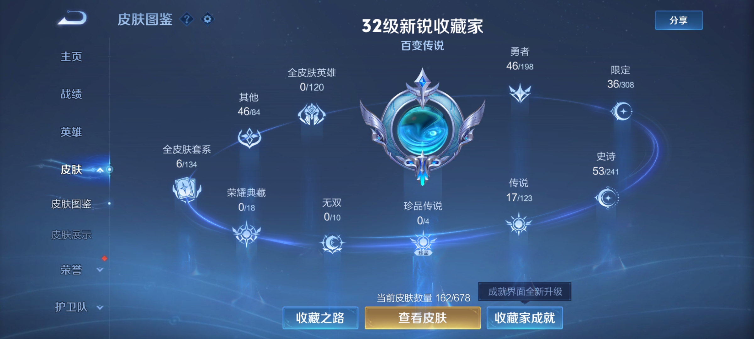 - PX_2093851-实名: 可修改 贵族等级: V8 英雄数: 122 皮肤数: 226 荣耀水晶: 拾光映像 珍品传说: 江户川柯南,时之奇旅-孙策 传说皮: 音你心动-小乔,花朝如约,追逃游戏(安琪拉),电玩·雷克斯,灼幽烈阳,鲁班七号-时之奇旅,大乔-时之奇旅,乘龙·问璇玑,牧神诗旅,玄雷天君,幻光神枪 限定皮: 凤凰于飞,五谷丰年,至美·乘鲤谣,鸣野蒿,陌上桑,逐霄战戟,愿照·众生和,愿