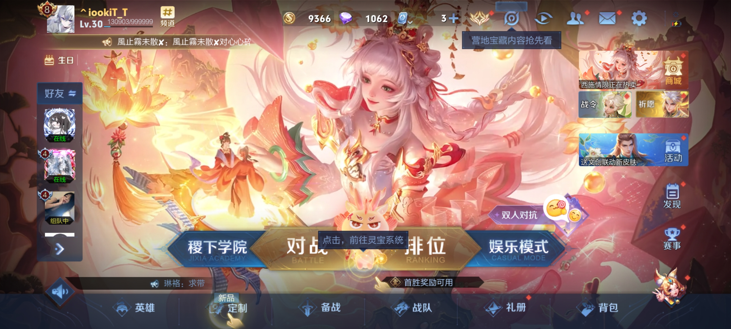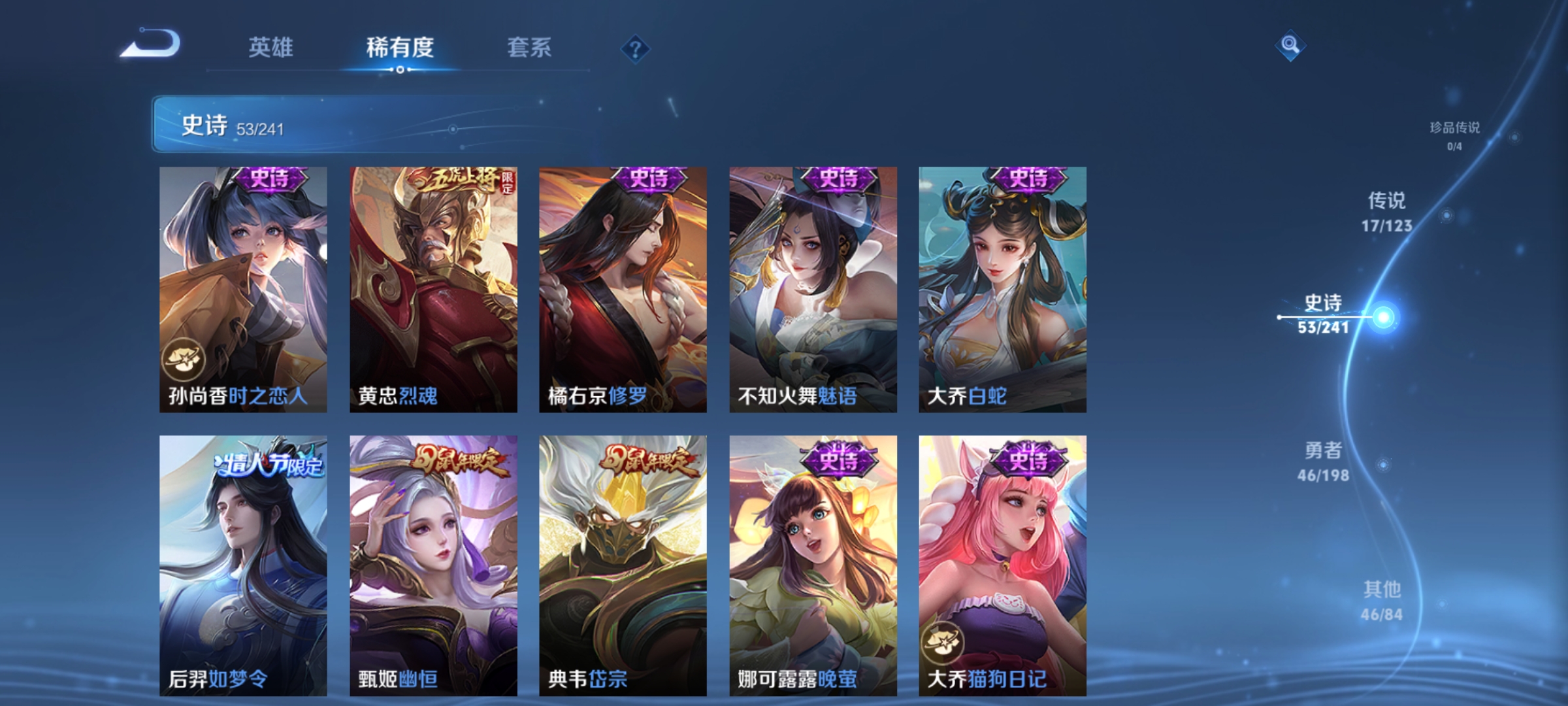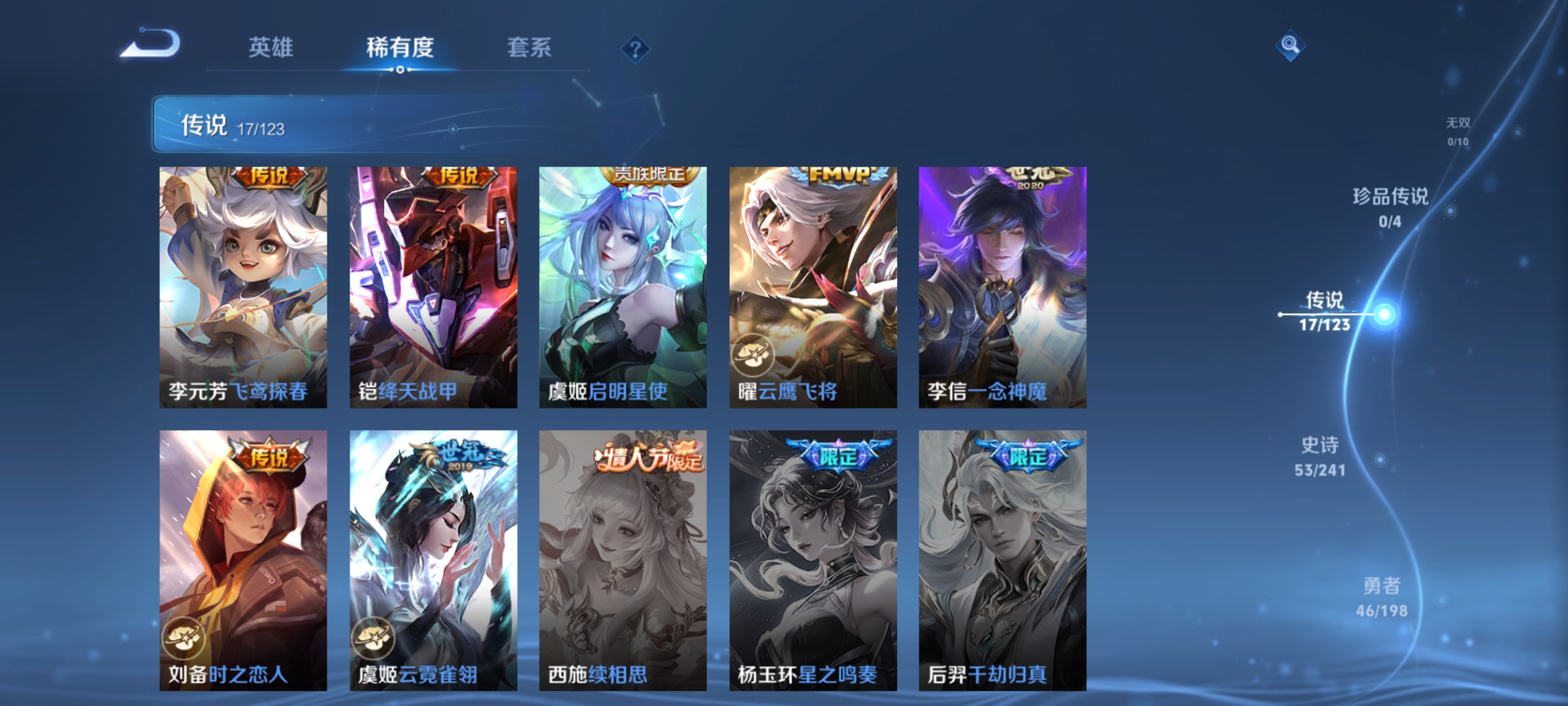 - PX_2038563-苹果Q 【可二次】 英雄数量:124 皮肤数量:252 贵族等级:贵族V8 【星传说 时之愿境 星际治安官】荣耀典藏3 传说品质24 史诗品质74九霄神辉 鸣剑曳影 天鹅之梦 李逍遥 诗剑行 时之祈愿女 挚爱花嫁 游龙清影 猫影幻舞 武陵仙君 一念神魔 深海之息 无双飞将 寅虎赤拳 炽阳神光 画中仙 神器狴犴令 前尘镜 挚爱之约 启示之音 启明星使 补天 惊梅引 胖达荣荣 超
