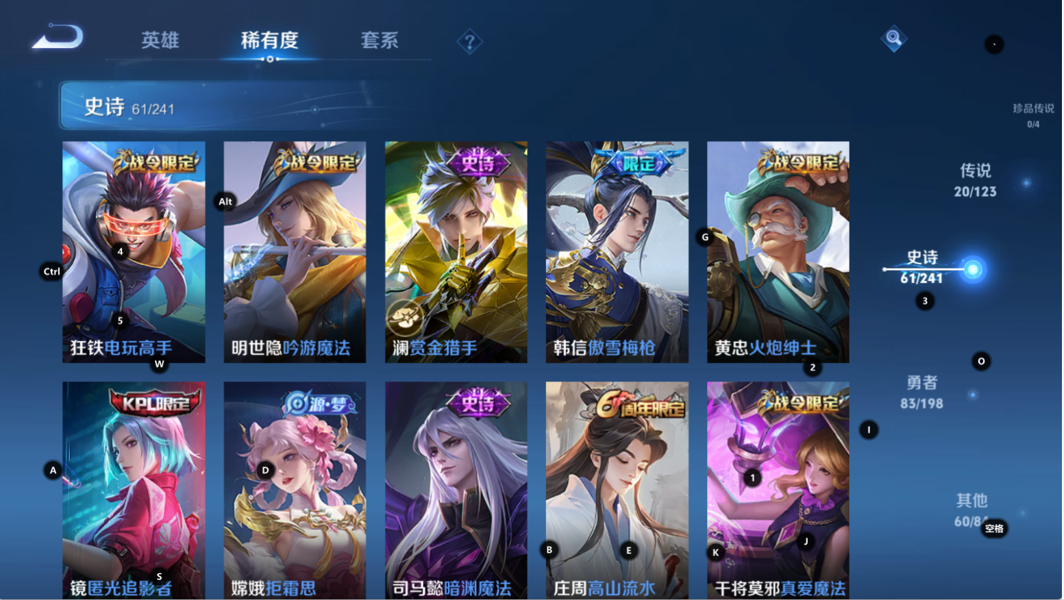 - PX_2070738-53 安卓QQ/至尊星耀/327皮肤/124英雄/1典藏/0珍品无双/1无双/3珍品传说/20传说/88史诗/9稀有英雄 【3 珍品传说】怪盗基德 马可波罗,时之奇旅 孙策,器灵·落星盏 嫦娥, 【1 典藏皮肤】弑枪猎影 韩信, 【1 无双皮肤】器灵·螭龙剑 曜, 【20 传说皮肤】胖达荣荣 梦奇,启明星使 虞姬,云霓雀翎 虞姬,无双飞将 马超,凤求凰 李白,时雨天司 诸葛亮