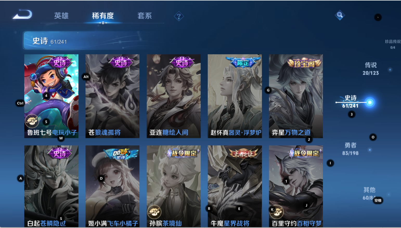 白起狰,曹操烛龙,狂铁御狮,盾山御銮,明世隐疑决卦,老夫子醍醐杖,鬼谷子原初探秘者,狄仁杰万华元夜,程咬金演武夺筹,钟馗驱傩正仪,苏烈千军破阵,沈梦溪星空之诺,李元芳银河之约,刘邦夺宝奇兵,马可波罗暗影游猎,元歌云间偶戏,弈星混沌棋,达摩沙漠行僧,兰陵王金庭之子,沈梦溪大漠名商,李元芳云中旅人,桑启海盐诗旅