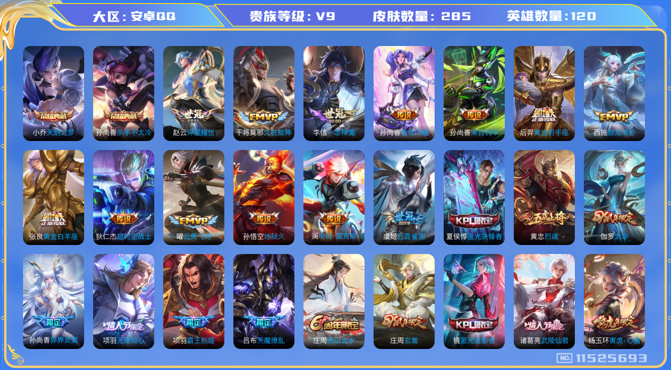 [11525693]V9 2典藏 24传说 120英雄 285皮肤 可修改实名 优质装备:天鹅之梦(小乔典藏),杀手不太冷,黄金射手座,云鹰飞将(小将军),黄金白羊座,久胜战神,一念神魔,云霓雀翎,末日机甲-孙尚香(绿蚂蚱),地狱火,游龙清影(小青龙),淬星耀世,超时空战士-狄仁杰,音你闪耀(rap皮),电玩·雷克斯 珍宝阁皮:蔷薇恋人,女武神 限定皮:太华(伽罗年限),武陵仙君(小桃花),异界灵契(白毛香),玄嵩(庄周年限),无限倾心-项羽,遇见飞天,高山流水,诗剑行,无限倾心-虞姬,匿光决锋者,五谷丰年,冰锋战神,梁祝,天狼狩猎者,烈魂,天狼绘梦者,李小龙,朱雀志(守约年限),霸王别姬-项羽,霸王别姬-虞姬,孙行者,猪悟能,大圣娶亲,天魔缭乱,神奇女侠,匿光追影者,寅虎·心曲(虎婆),寅虎·赤拳(老虎年限),玉兔公主,深海之息(深海大菠萝),枫霜尽,神器·万象笔 史诗皮:遇见神鹿,紫霞仙子,电玩小子(小书包),白龙吟,黄金分割率,特工魅影,千年之狐,永昼,魅语,无限星赏官,冰冠公主,晚萤,暗夜猫娘,龙骑士(小龙虾),末日机甲-吕布,猫狗日记-孙策,猫狗日记-大乔,时之恋人-孙尚香,乱世虎臣,节奏热浪,修罗,女仆咖啡,摇滚巨星,水果甜心,绅士熊喵,天才门将,星夜王子,心灵骇客,时之奇旅-安琪拉,功夫厨神,德古拉伯爵,暗隐猎兽者,幽灵船长,鬼剑武藏,暗渊魔法,心灵战警,舞动绿茵,地狱岩魂,纤云弄巧,繁星吟游(呼啦呼啦),拒霜思,缤纷独角兽,乘风破浪,逐浪之夏,龙鼓争鸣,水晶猎龙者,曙光守护者,箭羽风息,唤灵魅影,原初追逐者,圣诞狂欢,圣诞恋歌,鹰眼统帅,王者之锤,暗夜贵公子,魅力维加斯,黎明之约,赏金猎手,奇遇舞章,无心,未来纪元-赵云