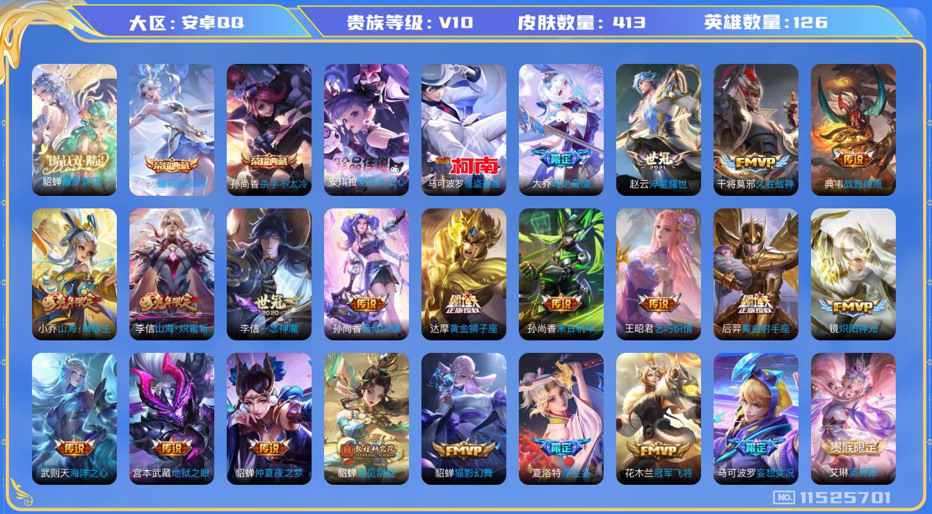 [11525701]V10 2典藏 1珍品无双 2珍品传说 46传说 126英雄 413皮肤 典藏英雄武则天 可修改实名 优质装备:馥梦繁花,杀手不太冷,最初的交响(伽罗典藏),怪盗基德,酷洛米之心,黄金狮子座,黄金射手座,冠军飞将,云鹰飞将(小将军),猫影幻舞,久胜战神,炽阳神光,一念神魔,云霓雀翎,末日机甲-孙尚香(绿蚂蚱),地狱火,仲夏夜之梦(大飞蛾),零号·赤焰,海洋之心,地狱之眼,李逍遥,乞巧织情,淬星耀世,超时空战士-狄仁杰,遇见胡旋,音你闪耀(rap皮),山海·炽霜斩(李信年限),山海·琳琅生(小乔年限),浮生妄,妄想实况,大乔-时之奇旅,艾琳觅芳踪,玄雷天君 传说皮:貂蝉曦玄引,典韦战鼓燎原,幻光神枪 珍宝阁皮:优雅恋人,玩趣恶龙 限定皮:愿照·九州拓(澜年限),愿照·福禄聚(蔡文姬年限),愿照·岁时盈(虞姬年限),愿照·山河定(司空震年限),愿照·众生和(妲己年限),愿照·千秋盛(女娲年限),陌上桑,鸣野蒿,至尊宝,凤求凰(白切鸡),太华(伽罗年限),武陵仙君(小桃花),魔法小厨娘,飞衡(韩信年限),遇见飞天,高山流水,诗剑行,齐天大圣,怒海麟威,五谷丰年,冰锋战神,天狼运算者,游园惊梦,梁祝,逐梦之星,天狼溯光者,天狼征服者,李小龙,辉光之辰,孙行者,大圣娶亲,天魔缭乱,热情桑巴,美猴王 史诗皮:鸭鸭历险记-刘禅,器灵·浮梦炉,狼魂孤将,化蝶舞,灵蛊蚀心,星界战将,龙之律动,石田雨龙,茶境仙,破空之剑,上官婉儿群星魔术团,蔬乡物语(鲁班七号),乘龙·聚宝船(安琪拉年限),百相守梦-百里守约,星界特工,百相守梦-黄忠,织梦人,遇见神鹿,紫霞仙子,苍穹之光,电玩小子(小书包),白龙吟,黄金分割率,特工魅影,千年之狐,永昼,浮梦罗烟,魅语,高渐离燃音魔法,无限星赏官,青蛇,偶像歌手,晚萤,暗夜猫娘,龙骑士(小龙虾),末日机甲-吕布,猫狗日记-孙策,猫狗日记-大乔,时之恋人-孙尚香,乱世虎臣,节奏热浪,修罗,女仆咖啡,摇滚巨星,水果甜心,绅士熊喵,天才门将,星夜王子,心灵骇客,功夫厨神,德古拉伯爵,暗隐猎兽者,幽灵船长,鬼剑武藏,暗渊魔法,心灵战警,乐园奇幻夜,天秀·启明,舞动绿茵,地狱岩魂,诗语江南,纤云弄巧,繁星吟游(呼啦呼啦),缤纷独角兽,乘风破浪,逐浪之夏,水晶猎龙者,曙光守护者,热力回旋,箭羽风息,唤灵魅影,金属风暴,原初追逐者,圣诞狂欢,圣诞恋歌,鹰眼统帅,