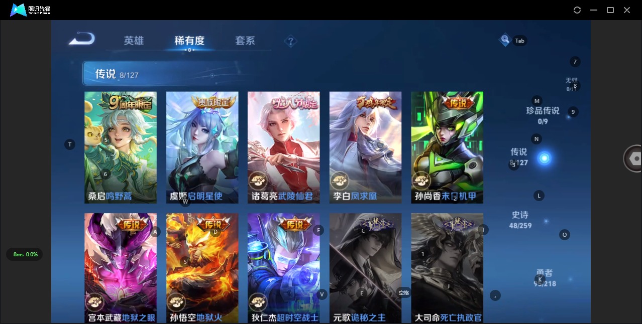 - [11688700]V8 1典藏 1无双 2珍品传说 15传说 124英雄 209皮肤 可修改实名 优质装备:鸣剑·曳影,天机白泽,朽木白哉,黑崎一护,黄金狮子座,炽阳神光,一念神魔,胖达荣荣,浮生妄,涂山容容 传说皮:死亡执政官,九山相柳,幻光神枪 珍宝阁皮:妄想食味,玩趣恶龙 限定皮:愿照·九州拓(澜年限),愿照·岁时盈(虞姬年限),愿照·山河定(司空震年限),鸣野蒿,傲雪梅枪,五谷丰年,永曜之星,辉光之辰,孙行者,猪悟能,引擎之心,寅虎·御盾(廉颇年限),寅虎·赤拳(老虎年限),玉兔公主,山海·玄木吟(马可年限) 史诗皮:鸭鸭历险记-刘禅,器灵·浮梦炉,糖绘人间,狼魂孤将,化蝶舞,星界战将,谪仙醉月,龙之律动,藏狐·褐绒,石田雨龙,百相守梦-周瑜,茶境仙,幻珠鲛人,破空之剑,埋骨钱,芈月浮光幕影,上官婉儿群星魔术团,百相守梦-黄忠,紫霞仙子,黄金分割率,特工魅影,千年之狐,永昼,江河有灵,魅语,蒙恬荣光圣徽,冰冠公主,青蛇,偶像歌手,晚萤,末日机甲-吕布,猫狗日记-孙策,时之恋人-孙尚香,乱世虎臣,修罗,女仆咖啡,水果甜心,星夜王子,德古拉伯爵,暗隐猎兽者,幽灵船长,鬼剑武藏,天秀·启明,缤纷独角兽,乘风破浪,龙鼓争鸣,水晶猎龙者,曙光守护者,热力回旋,箭羽风息,原初追逐者,圣诞狂欢,鹰眼统帅,魅力维加斯,赏金猎手,滕王阁序,寅虎·御盾,无心
