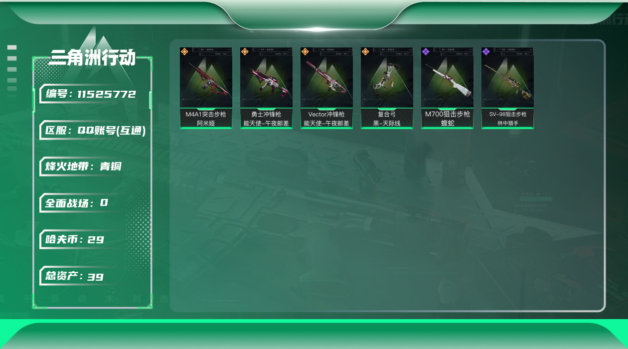 [11525772]总资产:39.1M 4传说枪械 哈夫币:29.401K 可二次 可修改实名 烽火地带段位:青铜 全面战场段位:无段位 传说武器皮肤:M4A1突击步枪-阿米娅,复合弓-黑-天际线,勇士冲锋枪-能天使-午夜邮差,Vector冲锋枪-能天使-午夜邮差 史诗武器皮肤:M700狙击步枪-蝮蛇,SV-98狙击步枪-林中猎手