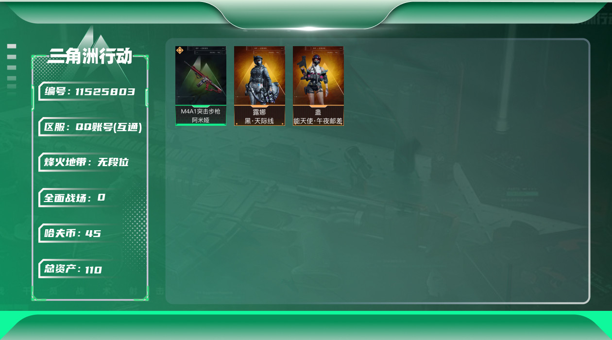 [11525803]总资产:110.6M 2干员外观 1传说枪械 哈夫币:45.729K 进阶安全箱(2×2)9.15号到期 可二次 可修改实名 烽火地带段位:无段位 全面战场段位:无段位 传说武器皮肤:M4A1突击步枪-阿米娅 干员外观:露娜-黑·天际线,蛊-能天使·午夜邮差