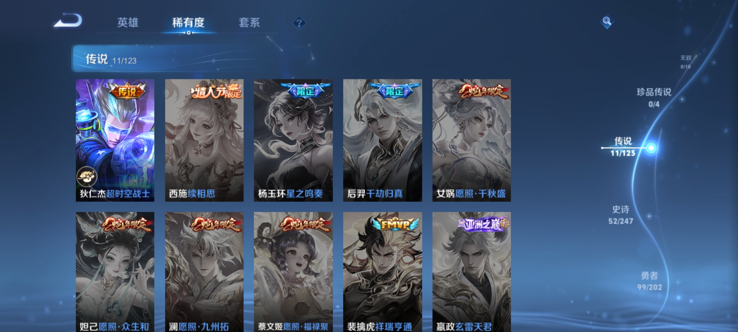 [11525804]司空震蛇年限,虞姬蛇年限,澜逐花归海,-不可二次-V7-121英雄-215皮肤-11传说-52史诗 浮生妄-夏洛特 引擎之心-赵云 街头霸王-韩信