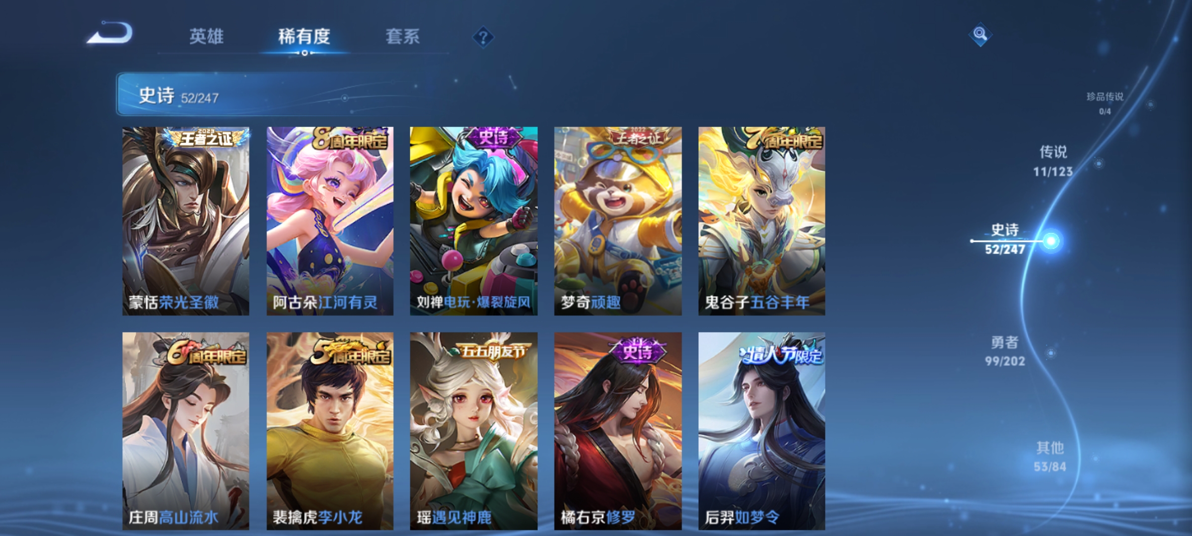 瑶遇见神鹿,伽罗箭羽风息,大乔猫狗日记,孙策猫狗日记,韩信白龙吟,吕布末日机甲,橘右京修罗,墨子龙骑士,嬴政摇滚巨星,刘禅绅士熊喵,白起星夜王子,安琪拉心灵骇客,刘邦德古拉伯爵,宫本武藏鬼剑武藏,亚瑟心灵战警,蔡文姬舞动绿茵,廉颇地狱岩魂,小乔缤纷独角兽,夏侯惇乘风破浪,铠曙光守护者,墨子金属风暴,百里守约特工魅影,刘禅电玩·爆裂旋风,赵怀真器灵·浮梦炉