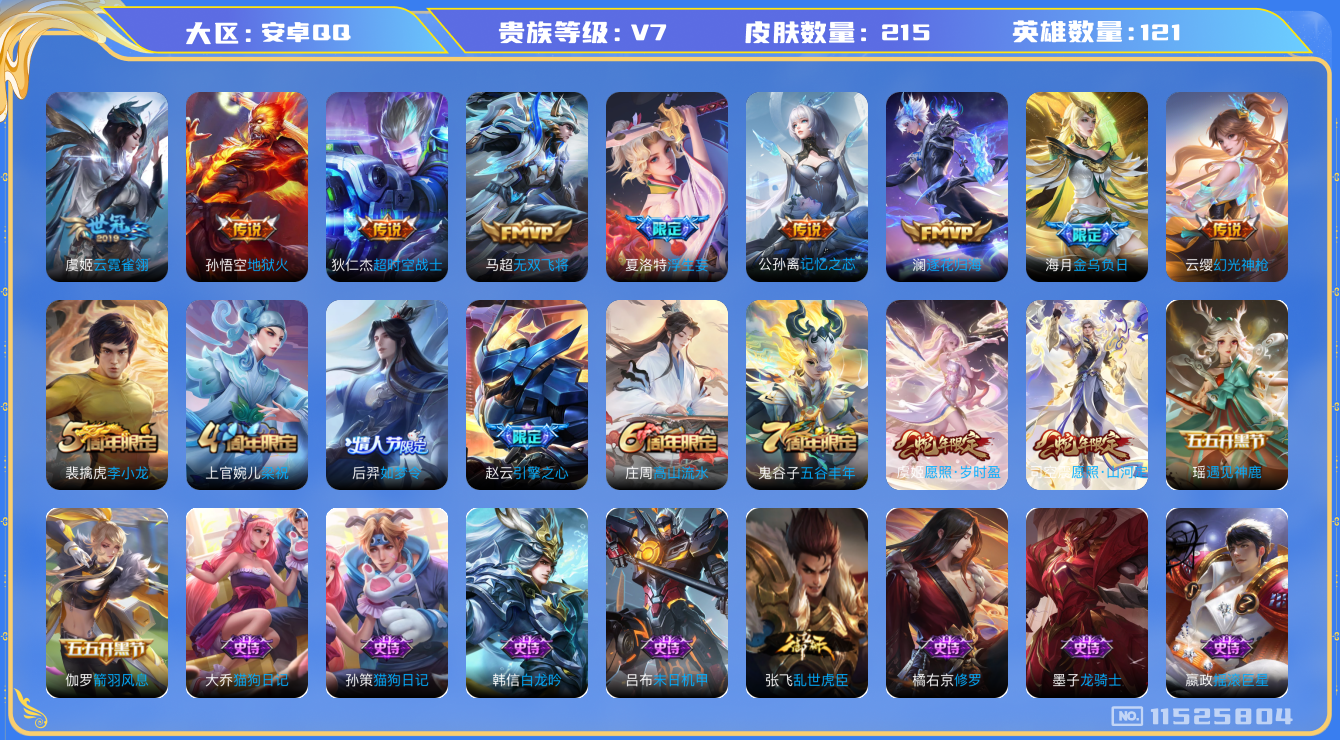 - [11229053]V7 16传说 125英雄 180皮肤 可修改实名 优质装备:黄金狮子座,云鹰飞将(小将军),云霓雀翎,飞鸢探春,时之恋人-刘备(电焊工),惊梅引,遇见神鼓,澜逐花归海,琥珀纪元铠,琥珀纪元马超,黄金天蝎座 传说皮:乘龙·铭钟鼎(赵云年限),典韦战鼓燎原 珍宝阁皮:胡桃夹子,万物之道 限定皮:愿照·山河定(司空震年限),鸣野蒿,诗剑行,岱宗(典韦年限),李小龙,孙行者,山海·玄木吟(马可年限) 史诗皮:器灵·浮梦炉,龙之律动,石田雨龙,蔬乡物语(鲁班七号),琥珀纪元伽罗,百相守梦-黄忠,黄金分割率,匿光侦查者,百解令(蒙犽),高渐离燃音魔法,偶像歌手,猫狗日记-孙策,猫狗日记-大乔,乱世虎臣,节奏热浪,修罗,女仆咖啡,摇滚巨星,水果甜心,绅士熊喵,天才门将,星夜王子,功夫厨神,幽灵船长,鬼剑武藏,暗渊魔法,地狱岩魂,纤云弄巧,拒霜思,缤纷独角兽,乘风破浪,金属风暴,圣诞狂欢,鹰眼统帅,魅力维加斯
