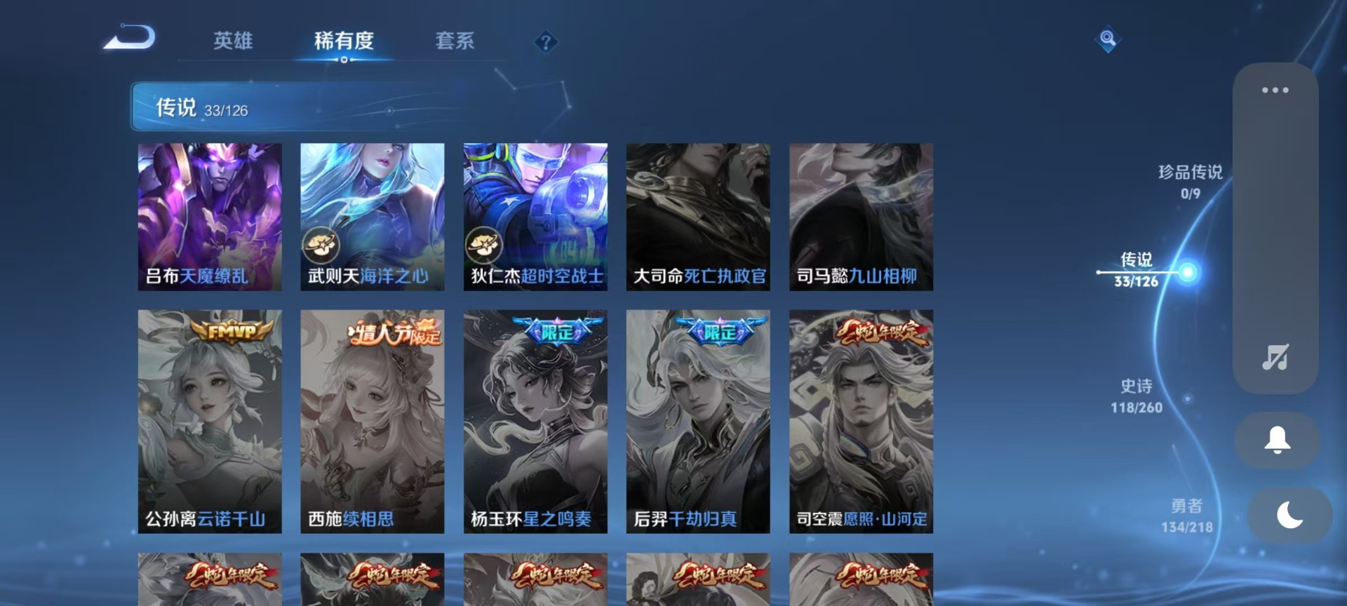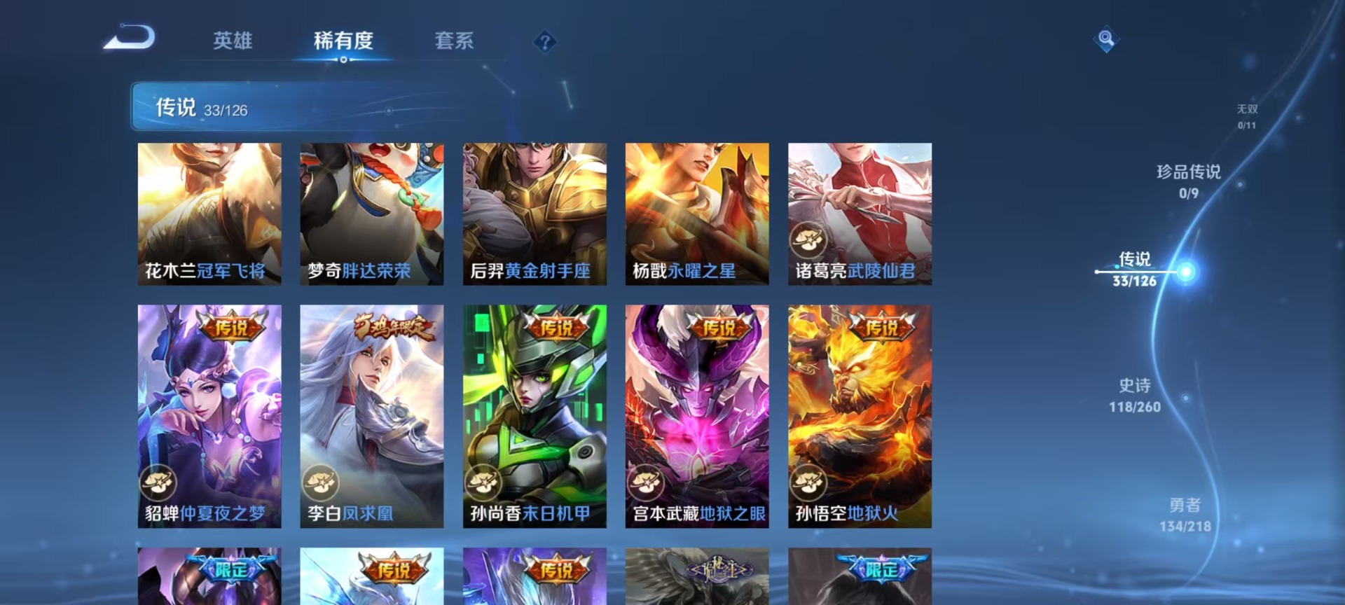 - [11234723]V4 1典藏 3传说 123英雄 169皮肤 可修改实名 荣耀水晶:鸣剑·曳影 传说皮:幻光神枪 珍宝阁皮:妄想食味,蔷薇恋人 限定皮:愿照·山河定(司空震年限),逐霄战戟,鸣野蒿,梁祝,李小龙,猪悟能 史诗皮:龙之律动,化蝶舞,白龙吟,千年之狐,江河有灵,百解令(蒙犽),冰冠公主,乱世虎臣,女仆咖啡,摇滚巨星,水果甜心,星夜王子,功夫厨神,德古拉伯爵,鬼剑武藏,心灵战警,地狱岩魂,乘风破浪,逐浪之夏,曙光守护者,箭羽风息,金属风暴,圣诞狂欢,圣诞恋歌,鹰眼统帅