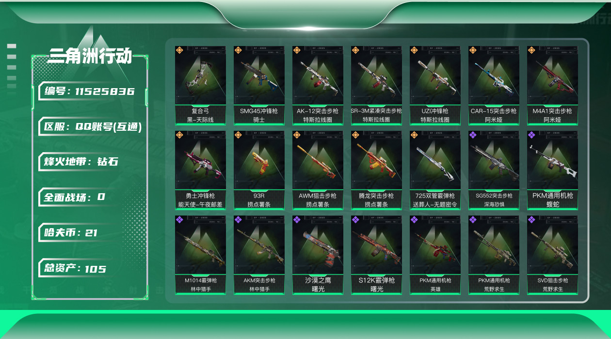 [11525836]总资产:105.6M 1干员外观 12传说枪械 哈夫币:21.849K 高级安全箱(9.17到期) 可二次 可修改实名 烽火地带段位:钻石 全面战场段位:无段位 传说武器皮肤:SMG45冲锋枪-骑士,M4A1突击步枪-阿米娅,CAR-15突击步枪-阿米娅,复合弓-黑-天际线,AWM狙击步枪-捞点薯条,腾龙突击步枪-捞点薯条,93R-捞点薯条,AK-12突击步枪-特斯拉线圈,SR-3M紧凑突击步枪-特斯拉线圈,UZI冲锋枪-特斯拉线圈,勇士冲锋枪-能天使-午夜邮差,725双管霰弹枪-送葬人-无题密令 史诗武器皮肤:PKM通用机枪-蝮蛇,M16A4突击步枪-竞赛选手,PKM通用机枪-荒野求生,SG552突击步枪-深海恐惧,AKM突击步枪-林中猎手,SR-3M紧凑突击步枪-荒野求生,M1014霰弹枪-林中猎手,SVD狙击步枪-荒野求生,M250通用机枪-囚徒,SV-98狙击步枪-囚徒,腾龙突击步枪-无垢,MP7冲锋枪-无垢,PSG-1射手步枪-无垢,沙漠之鹰-曙光,S12K霰弹枪-曙光,PKM通用机枪-英雄 干员外观:蜂医-送葬人·无题密令(S5)