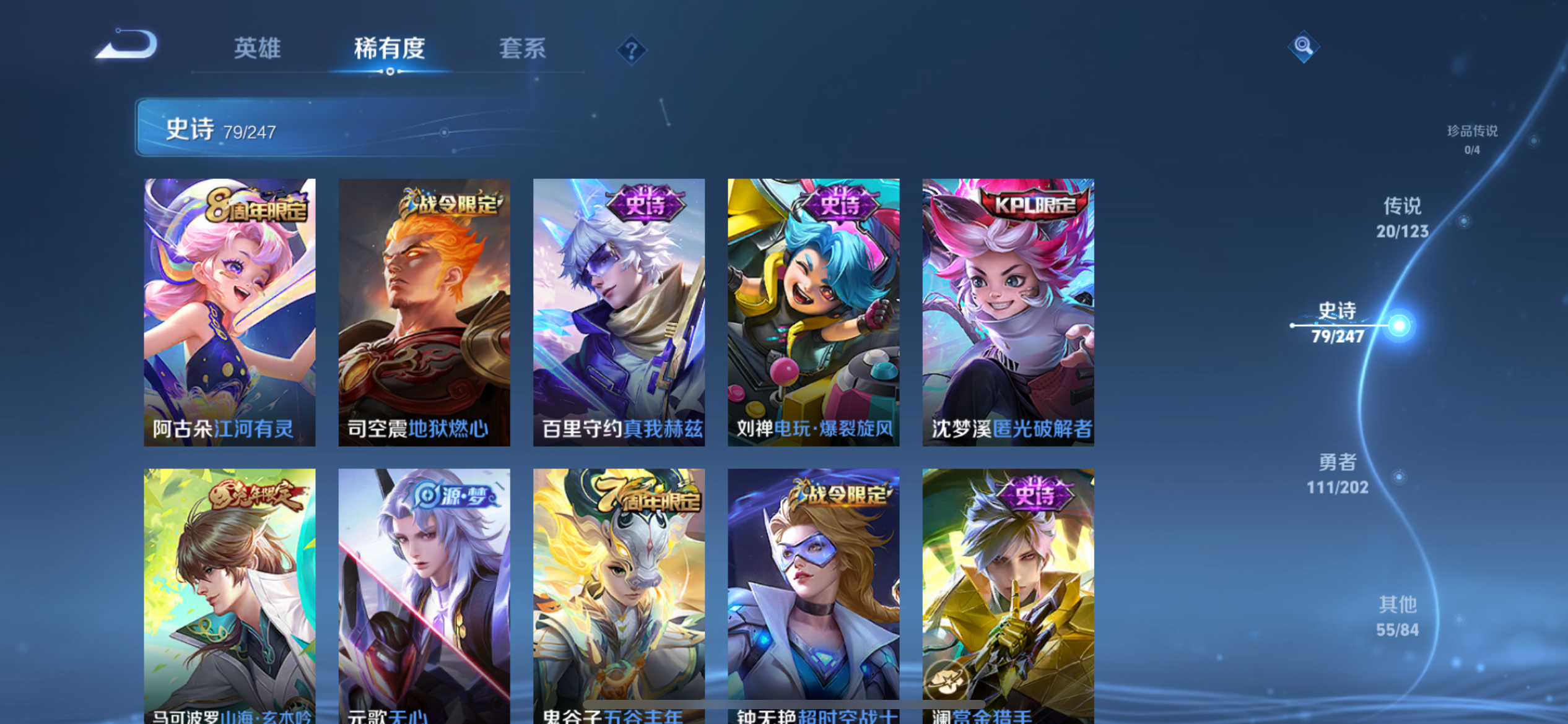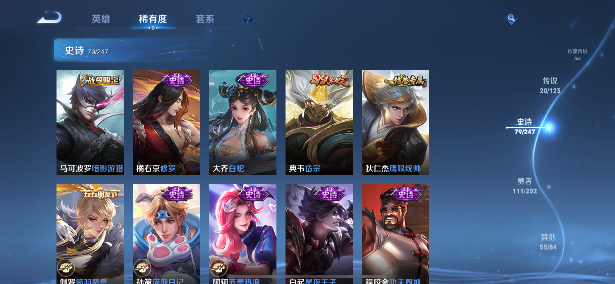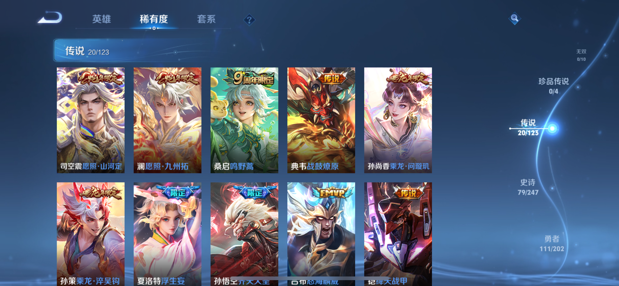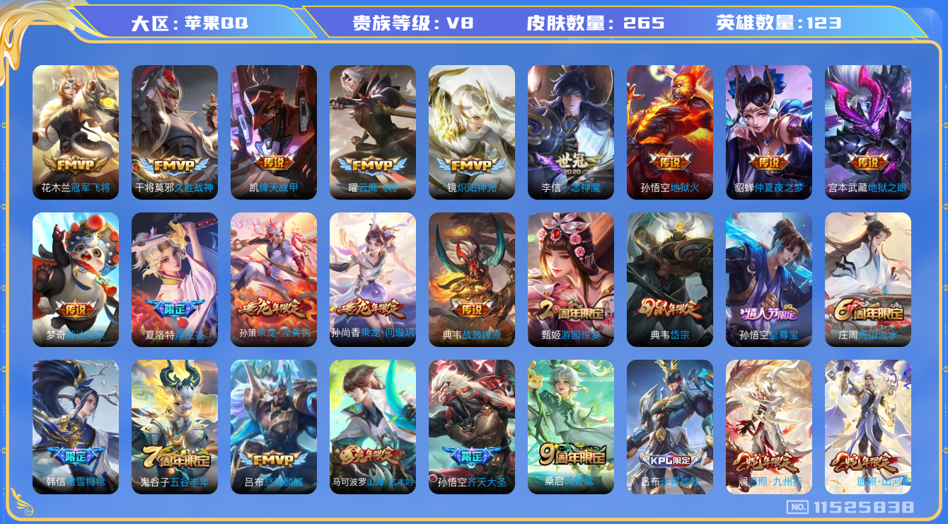 [11525838]司空震蛇年限,澜蛇年限,久胜,小将军,仲夏夜,孙尚香年限,紫霞,至尊宝,马可年限,-可二次-122英雄-265皮肤-20传说-79史诗 炽阳神光-镜 齐天大圣-孙悟空 浮生妄-夏洛特 山海·玄木吟-马可波罗 岱宗-典韦 至尊宝-孙悟空 匿光破解者-沈梦溪 街头霸王-韩信