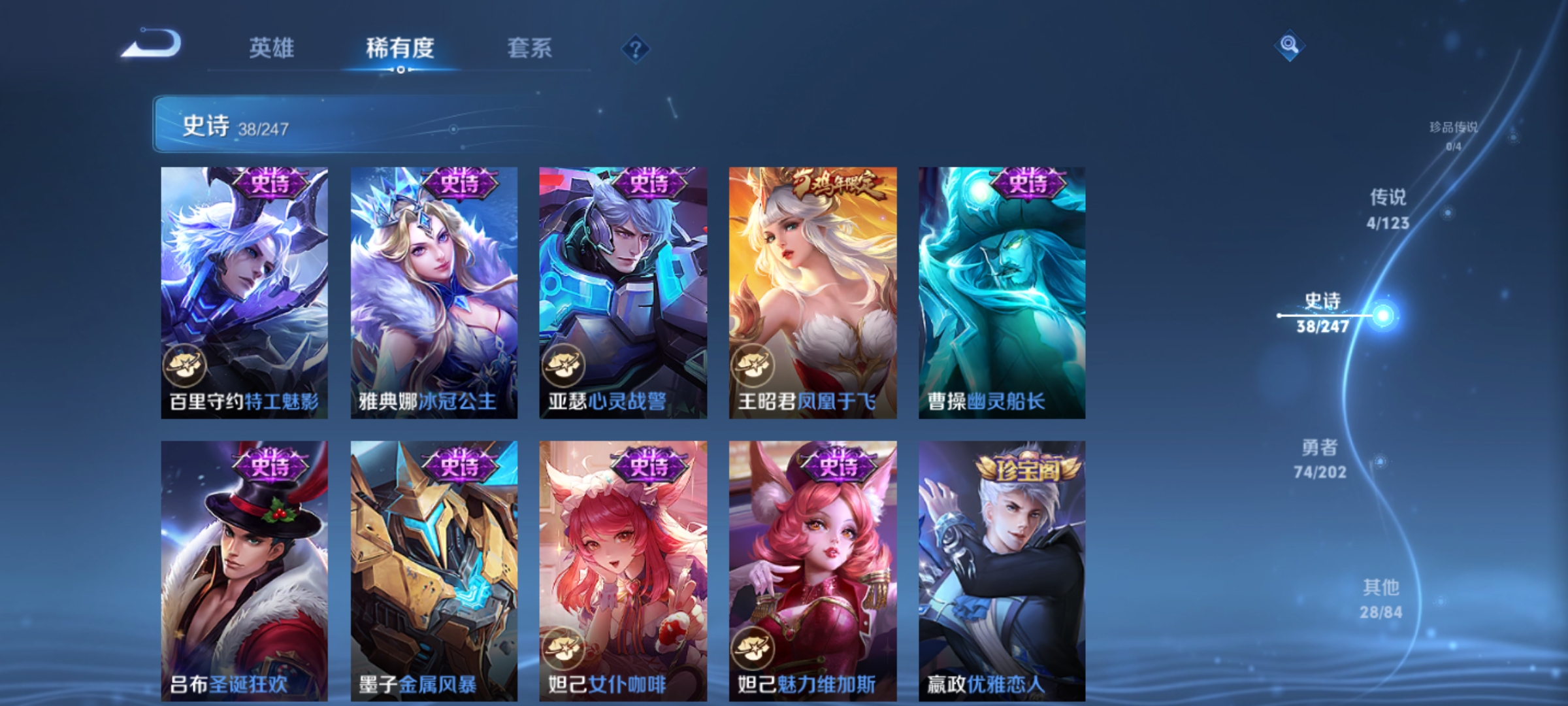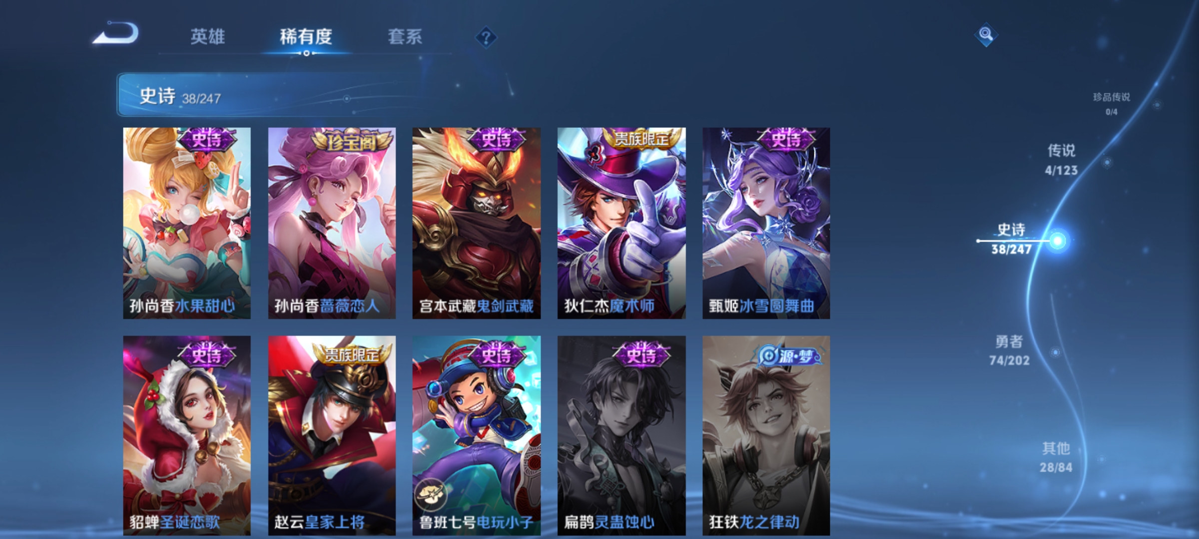 曹操烛龙,芈月重明,典韦穷奇,狂铁御狮,米莱狄御霄,牛魔御旌,夏侯惇朔风刀,明世隐疑决卦,老夫子醍醐杖,鬼谷子原初探秘者,狄仁杰万华元夜,程咬金演武夺筹,钟馗驱傩正仪,苏烈千军破阵,马可波罗暗影游猎,元歌云间偶戏,弈星混沌棋,达摩沙漠行僧,兰陵王金庭之子,沈梦溪大漠名商,李元芳云中旅人,桑启海盐诗旅,裴擒虎擒涛扼浪,鲁班大师探海日志,张良古海寻踪
