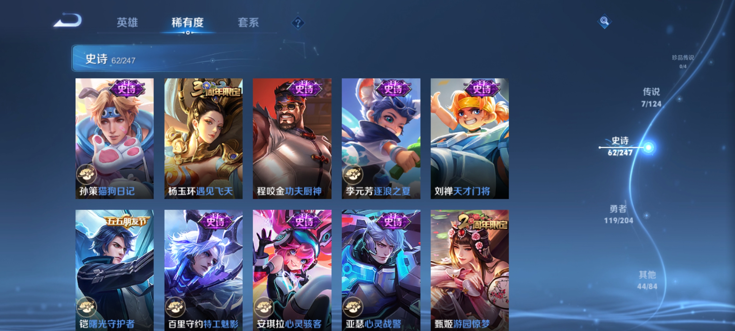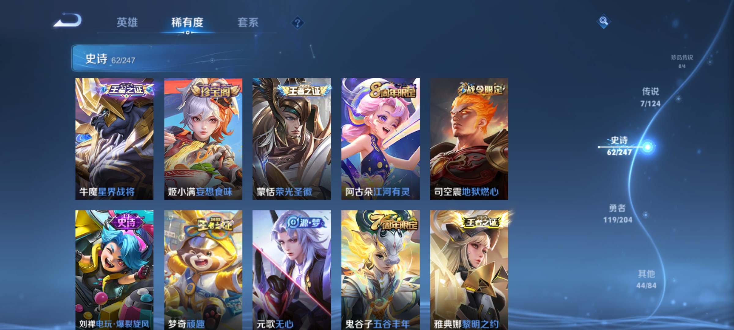 孙膑妖精王,扁鹊炼金王,虞姬凯尔特女王,白起狰,太乙真人饕餮,曹操烛龙,典韦穷奇,狂铁御狮,米莱狄御霄,牛魔御旌,盾山御銮,夏侯惇朔风刀,明世隐疑决卦,老夫子醍醐杖,鬼谷子原初探秘者,狄仁杰万华元夜,程咬金演武夺筹,钟馗驱傩正仪,苏烈千军破阵,吕布猎兽之王,钟馗神迹守卫,鲁班七号狮舞东方,沈梦溪星空之诺,李元芳银河之约,马可波罗暗影游猎,蒙犽狂想玩偶喵,元歌云间偶戏,弈星混沌棋,达摩沙漠行僧,兰陵王金庭之子,沈梦溪大漠名商,李元芳云中旅人,桑启海盐诗旅,裴擒虎擒涛扼浪,鲁班大师探海日志,张良古海寻踪