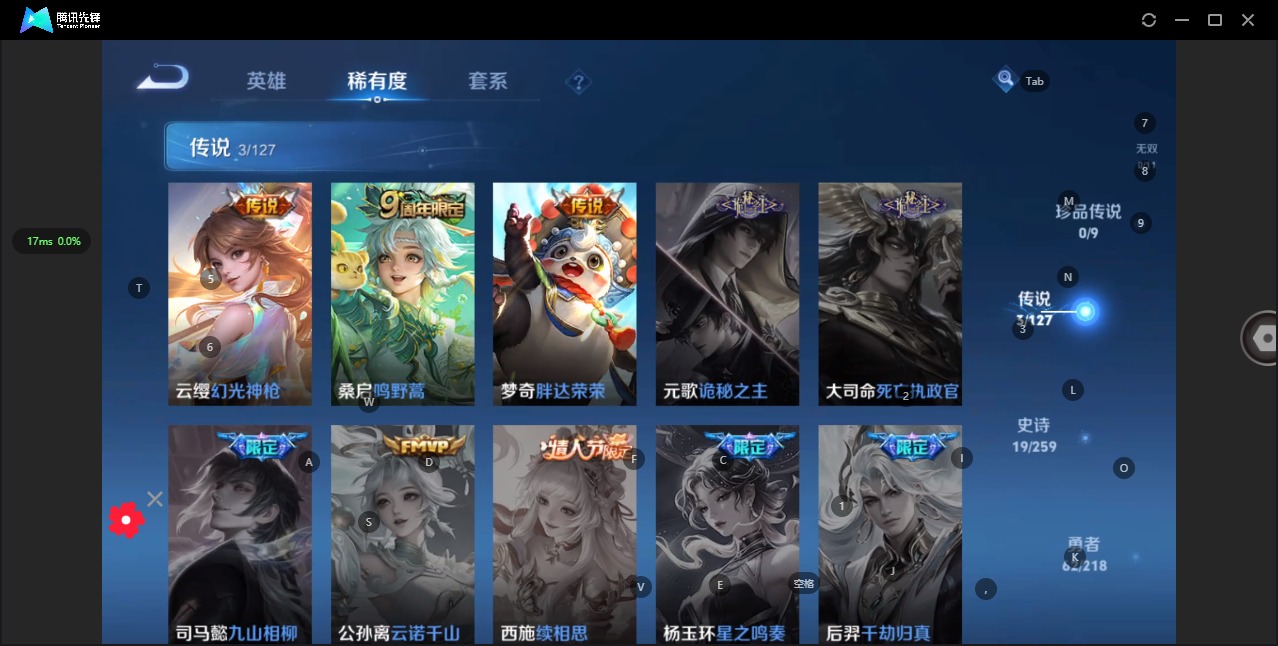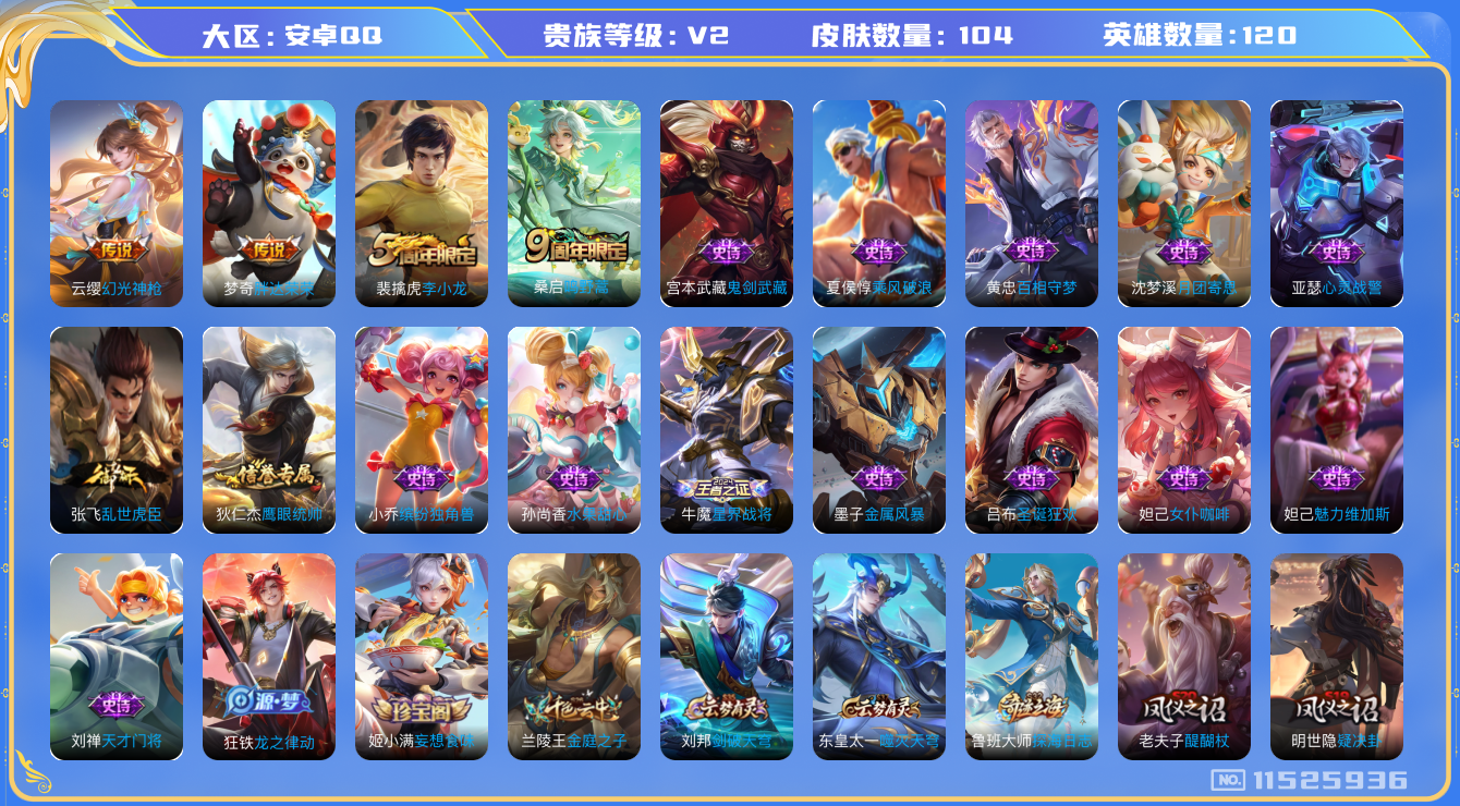 - [11529126]V6 4传说 109英雄 85皮肤 可修改实名 优质装备:云鹰飞将(小将军),无双飞将,澜逐花归海 传说皮:落雪白狼 珍宝阁皮:万物之道 限定皮:五谷丰年,神器·万象笔 史诗皮:化蝶舞,龙之律动,百相守梦-黄忠,特工魅影,江河有灵,百解令(蒙犽),水果甜心,鬼剑武藏,曙光守护者,金属风暴,鹰眼统帅,魅力维加斯,未来纪元-赵云