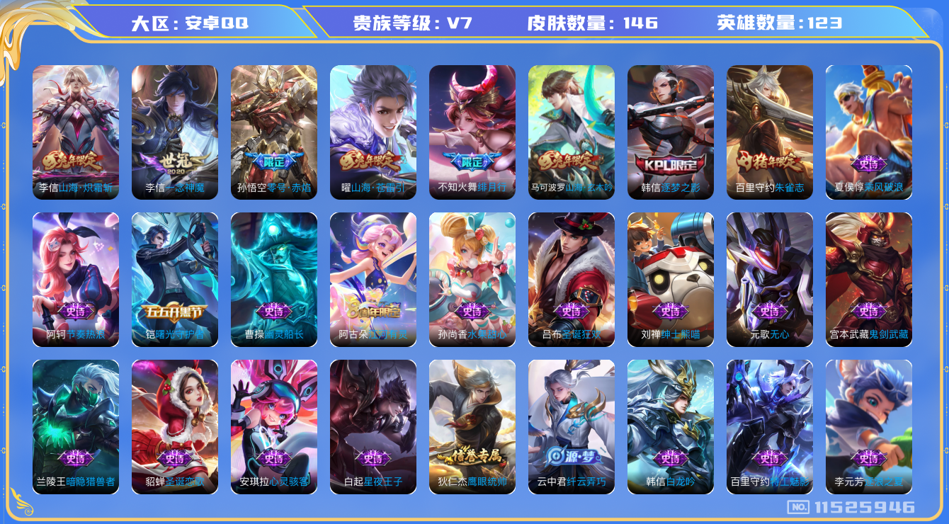 - [11818100]V7 2典藏 8传说 123英雄 231皮肤 可修改实名 优质装备:鸣剑·曳影,银白咏叹调(倪克斯侍卫),猫影幻舞,炽阳神光,一念神魔,云霓雀翎,地狱之眼,时之恋人-刘备(电焊工) 珍宝阁皮:优雅恋人,蔷薇恋人 限定皮:异界灵契(白毛香),高山流水,五谷丰年,天狼运算者,梁祝,天狼溯光者,天狼绘梦者,李小龙,朱雀志(守约年限),孙行者,猪悟能,青春决赛季,匿光追影者,女儿国国王,寅虎·御盾(廉颇年限),寅虎·赤拳(老虎年限) 史诗皮:紫霞仙子,苍穹之光,电玩小子(小书包),特工魅影,魅语,冰冠公主,偶像歌手,晚萤,暗夜猫娘,龙骑士(小龙虾),末日机甲-吕布,猫狗日记-孙策,猫狗日记-大乔,乱世虎臣,节奏热浪,修罗,女仆咖啡,摇滚巨星,水果甜心,绅士熊喵,天才门将,星夜王子,心灵骇客,时之奇旅-安琪拉,功夫厨神,德古拉伯爵,暗隐猎兽者,幽灵船长,鬼剑武藏,心灵战警,舞动绿茵,地狱岩魂,繁星吟游(呼啦呼啦),缤纷独角兽,乘风破浪,逐浪之夏,龙鼓争鸣,水晶猎龙者,曙光守护者,箭羽风息,金属风暴,原初追逐者,圣诞狂欢,圣诞恋歌,鹰眼统帅,暗夜贵公子,魅力维加斯,黎明之约,寅虎·御盾,未来纪元-赵云