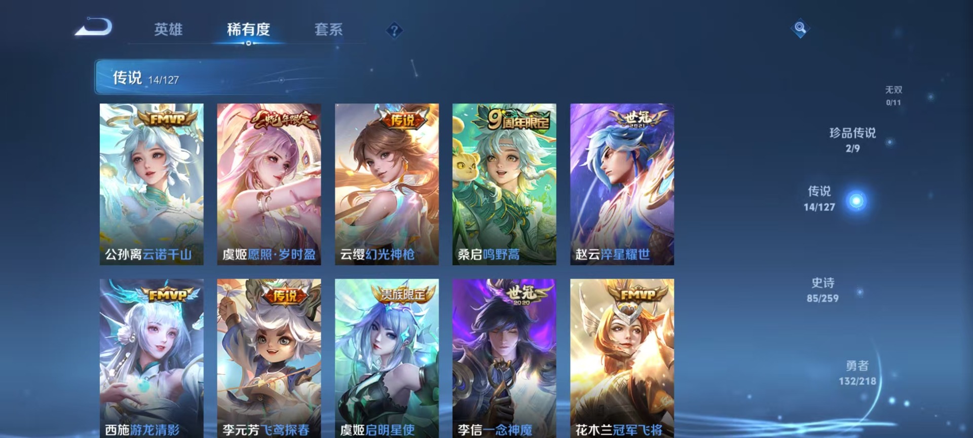 夏侯惇匿光决锋者,黄忠烈魂,伽罗天狼溯光者,后羿如梦令,庄周云端筑梦师,裴擒虎天狼狩猎者,上官婉儿梁祝,桑启鸣野蒿,猪八戒猪悟能,孙悟空孙行者,孙悟空大圣娶亲,孙悟空至尊宝,百里守约朱雀志,虞姬愿照·岁时盈