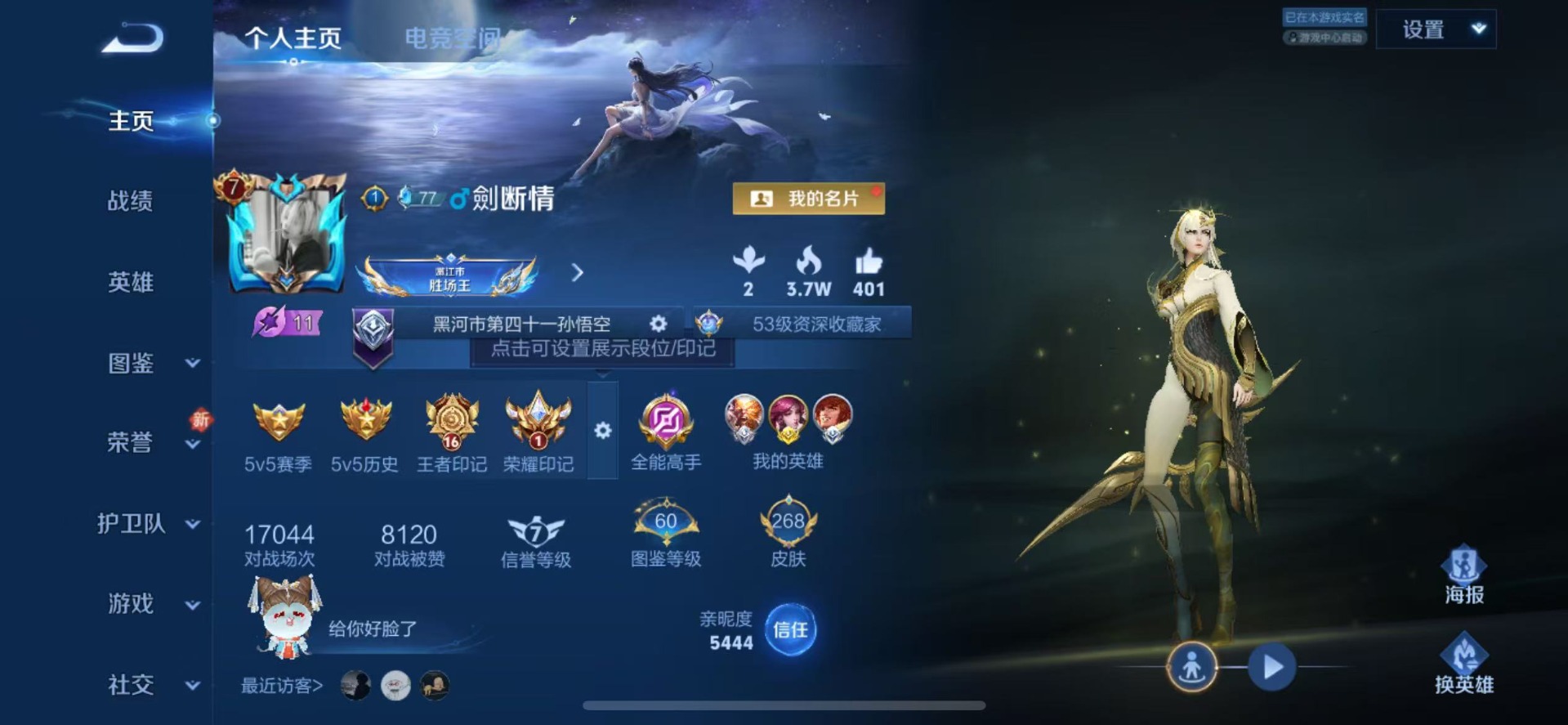 - PX_2081500-贵族等级: V5 英雄数: 103 皮肤数: 59 传说皮: 云鹰飞将,炽翼辉光 限定皮: 百木心枪,启示之音,鸣野蒿