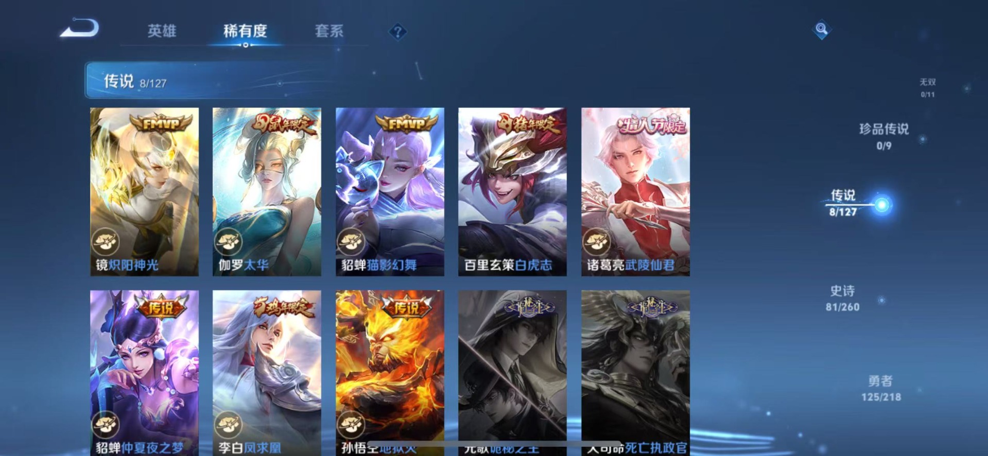 - [12298267]V8 3典藏 11传说 126英雄 206皮肤 典藏英雄武则天 可修改实名 优质装备:天鹅之梦(小乔典藏),星空梦想(太空人),鸣剑·曳影,末日机甲-孙尚香(绿蚂蚱),地狱火,仲夏夜之梦(大飞蛾),海洋之心,地狱之眼,小动物乐团,涂山容容 限定皮:鸣野蒿,至尊宝,凤求凰(白切鸡),凤凰于飞,梅西,武陵仙君(小桃花),绯月行,魔法小厨娘,冰锋战神,游园惊梦,梁祝,李小龙,朱雀志(守约年限),辉光之辰,霸王别姬-项羽,霸王别姬-虞姬 史诗皮:龙之律动,破空之剑,战舞者,蒙犽顽岩魄,紫霞仙子,苍穹之光,电玩小子(小书包),白龙吟,特工魅影,千年之狐,魅语,蒙恬荣光圣徽,冰冠公主,偶像歌手,白蛇,末日机甲-吕布,猫狗日记-大乔,节奏热浪,水果甜心,绅士熊喵,星夜王子,心灵骇客,德古拉伯爵,幽灵船长,鬼剑武藏,舞动绿茵,缤纷独角兽,乘风破浪,月团寄思,金属风暴,原初追逐者,圣诞狂欢,鹰眼统帅,暗夜贵公子,魅力维加斯,未来纪元-赵云