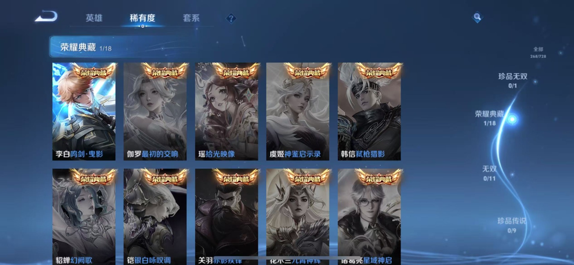 刘邦夺宝奇兵,夏侯惇朔风刀,老夫子醍醐杖,沈梦溪星空之诺,盾山御銮,曹操烛龙,苏烈千军破阵,典韦穷奇,典韦蓝屏警告,牛魔御旌,鲁班七号狮舞东方,吕布猎兽之王,裴擒虎擒涛扼浪,鲁班大师探海日志,明世隐疑决卦,马可波罗暗影游猎,白起狰,鬼谷子原初探秘者,张良古海寻踪,女娲朔望之晖,桑启海盐诗旅,狄仁杰万华元夜,嬴政白昼王子,芈月重明,程咬金演武夺筹,李元芳银河之约,李元芳云中旅人,弈星混沌棋,虞姬凯尔特女王,米莱狄御霄,钟馗神迹守卫,钟馗驱傩正仪,狂铁御狮,太乙真人饕餮