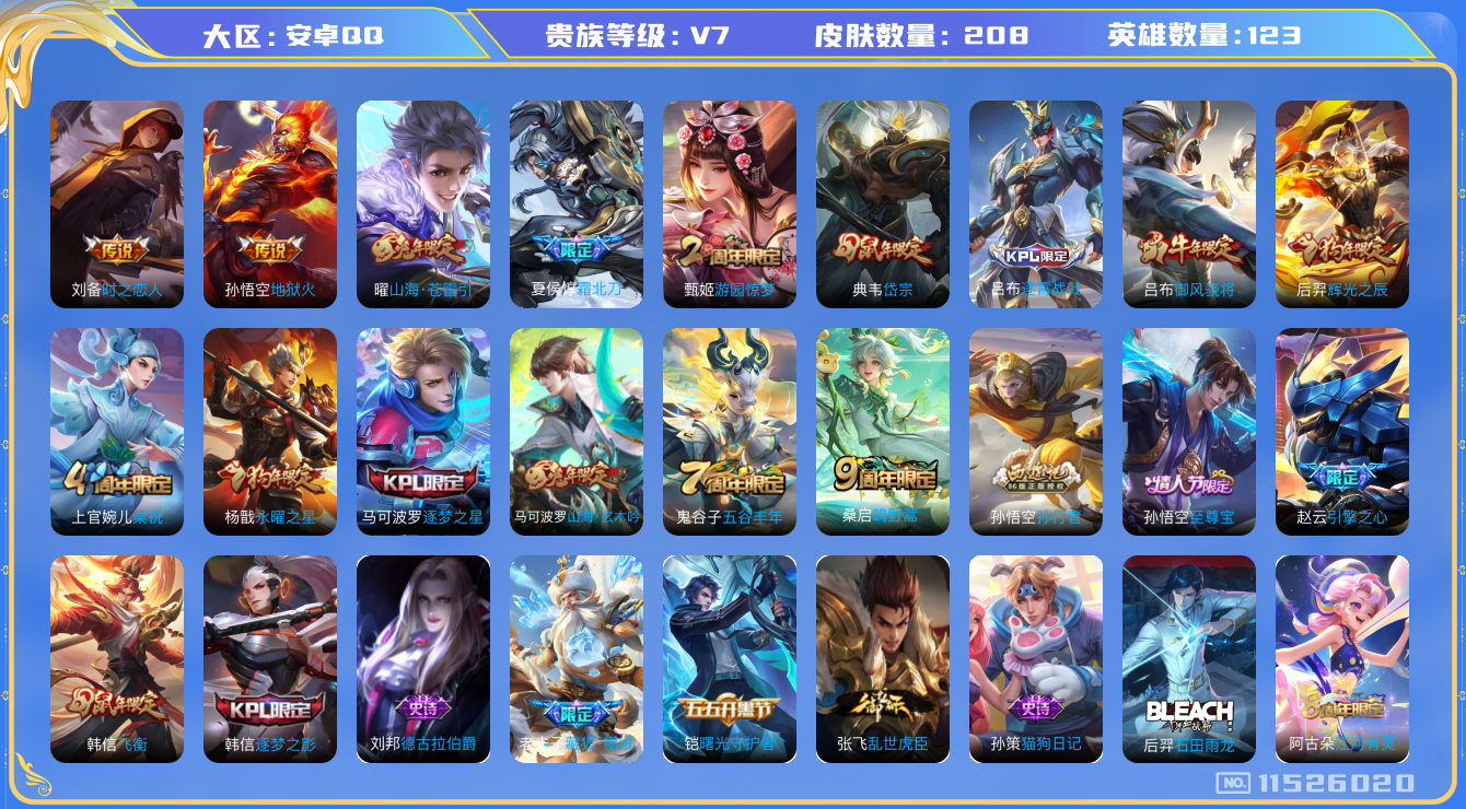 [11526020]V7 6传说 123英雄 208皮肤 可修改实名 优质装备:地狱火,时之恋人-刘备(电焊工),山海·苍雷引(电光曜子) 珍宝阁皮:妄想食味 限定皮:逐霄战戟,鸣野蒿,夏侯惇霜北刀,至尊宝,飞衡(韩信年限),五谷丰年,游园惊梦,梁祝,御风骁将(吕布年限),逐梦之星,岱宗(典韦年限),逐梦之影,永曜之星,辉光之辰,孙行者,引擎之心,山海·玄木吟(马可年限) 史诗皮:苍鳞隐世,器灵·浮梦炉,星界战将,龙之律动,藏狐·褐绒,石田雨龙,破空之剑,战舞者,紫霞仙子,苍穹之光,黄金分割率,特工魅影,千年之狐,江河有灵,蒙恬荣光圣徽,偶像歌手,晚萤,末日机甲-吕布,猫狗日记-孙策,乱世虎臣,修罗,水果甜心,天才门将,星夜王子,功夫厨神,德古拉伯爵,暗隐猎兽者,鬼剑武藏,心灵战警,繁星吟游(呼啦呼啦),逐浪之夏,水晶猎龙者,曙光守护者,金属风暴,原初追逐者,鹰眼统帅,魅力维加斯,赏金猎手,无心,未来纪元-赵云