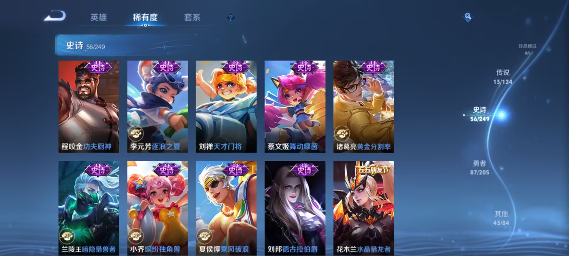 娜可露露晚萤,李元芳逐浪之夏,孙策猫狗日记,阿轲节奏热浪,诸葛亮黄金分割率,吕布末日机甲,橘右京修罗,刘禅天才门将,白起星夜王子,程咬金功夫厨神,刘邦德古拉伯爵,兰陵王暗隐猎兽者,曹操幽灵船长,宫本武藏鬼剑武藏,杨戬天秀·启明,蔡文姬舞动绿茵,小乔缤纷独角兽,夏侯惇乘风破浪,花木兰水晶猎龙者,墨子金属风暴,貂蝉圣诞恋歌,嫦娥拒霜思,雅典娜黎明之约,夏洛特永昼,刘备百相守梦,刘禅电玩·爆裂旋风,蒙犽百解令,赵怀真器灵·浮梦炉