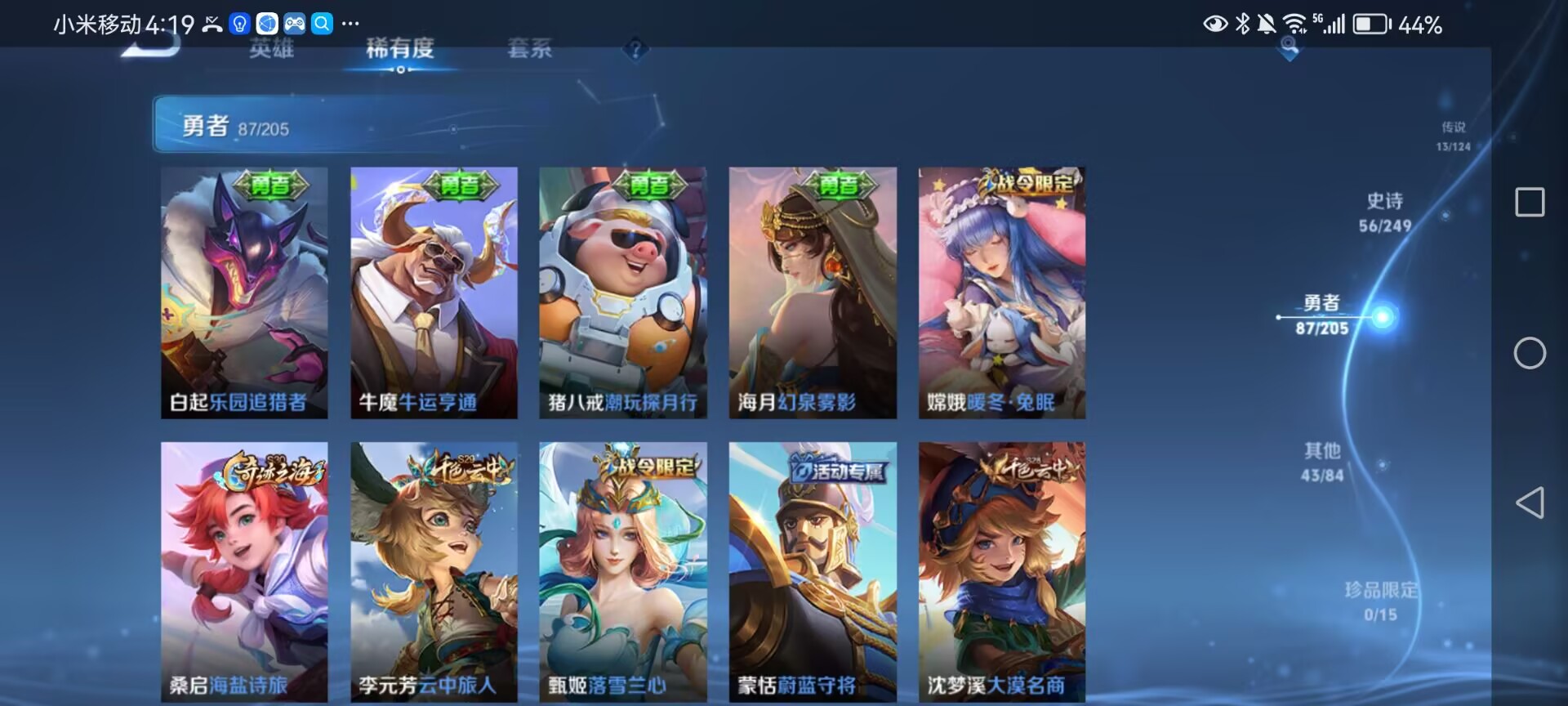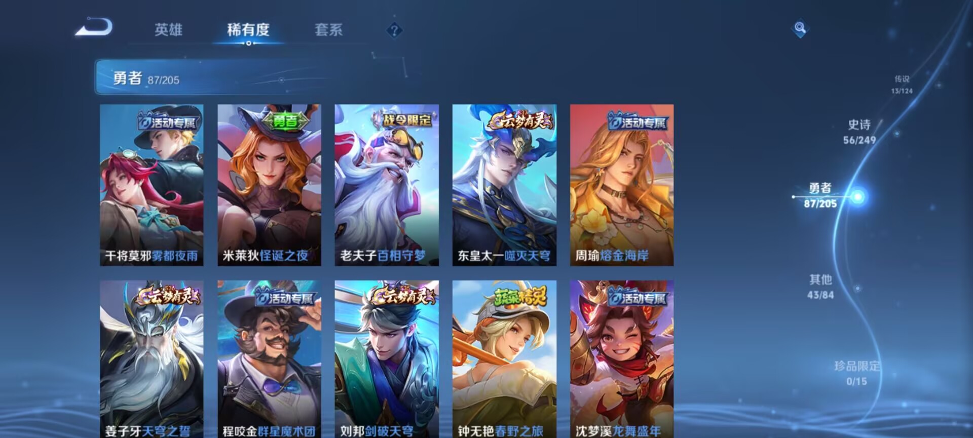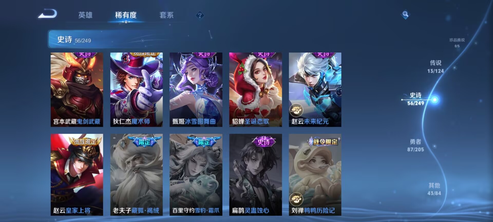 - PX_2086487-29 安卓QQ/永恒钻石/240皮肤/124英雄/1典藏/0珍品无双/0无双/4珍品传说/22传说/69史诗/8稀有英雄 【4 珍品传说】怪盗基德 马可波罗,时之奇旅 孙策,江户川柯南 鲁班七号,兔狲·蓬尾 张飞, 【1 典藏皮肤】银白咏叹调 铠, 【22 传说皮肤】启明星使 虞姬,飞鸢探春 李元芳,地狱之眼 宫本武藏,祈雪灵祝 公孙离,黄金射手座 后羿,乘龙·问璇玑 孙尚香