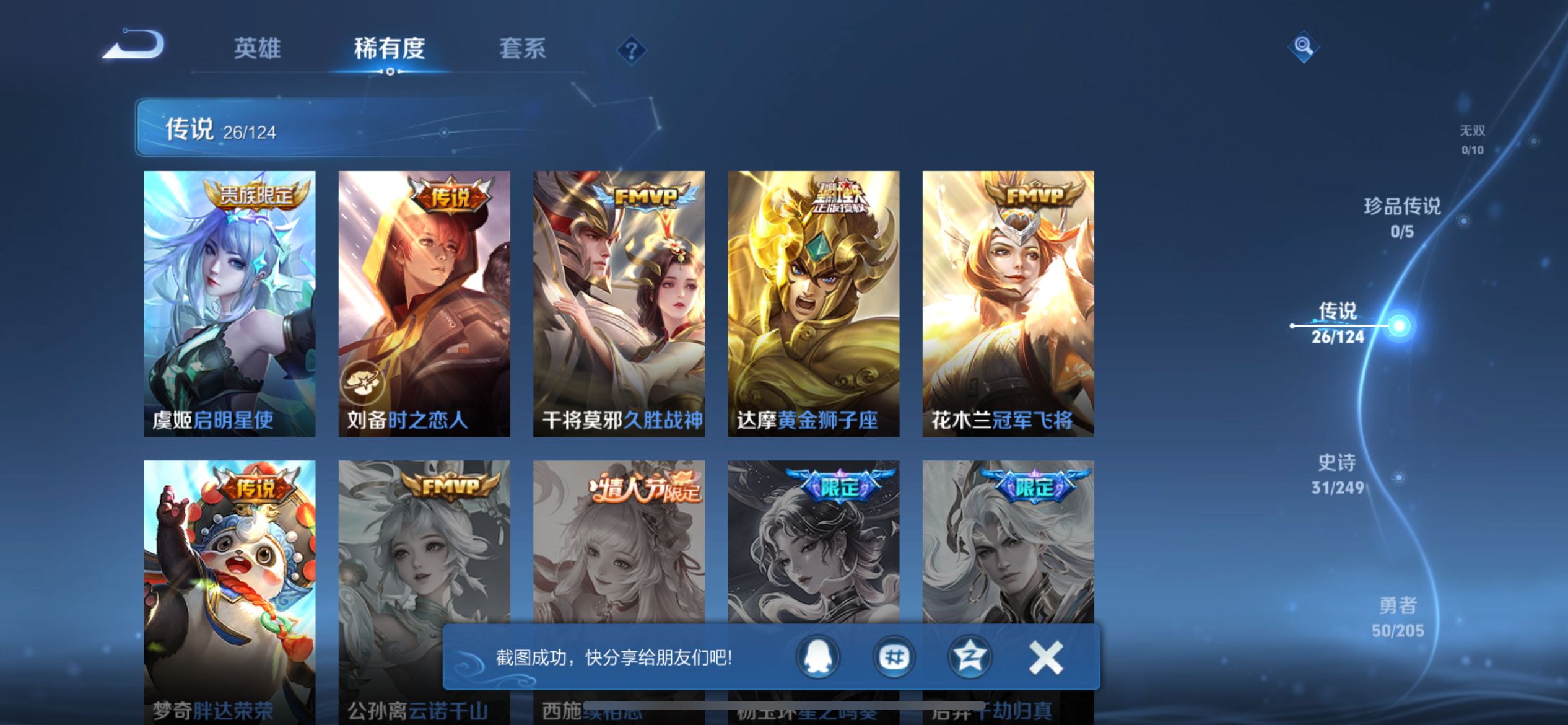 - [11682080]V10 3典藏 2无双 1珍品传说 35传说 126英雄 438皮肤 典藏英雄武则天 可修改实名 荣耀水晶:鸣剑·曳影,全息碎影(猴子典藏),无限飓风号(高达) 无双皮:器灵·螭龙剑,碎月剑心(李白无双) 珍品传说:器灵·落星盏 传说皮:云诺千山,祥瑞亨通,遇见胡旋,游龙清影(小青龙),黄金射手座,地狱火,仲夏夜之梦(大飞蛾),海洋之心,末日机甲-孙尚香(绿蚂蚱),云霓雀翎,一念神魔,冠军飞将,久胜战神,云鹰飞将(小将军),炽阳神光,无双飞将,音你心动-小乔,音你心动-周瑜,胖达荣荣,时之恋人-刘备(电焊工),末日机甲-孙策,艾琳觅芳踪 珍宝阁皮:万物之道,优雅恋人,蔷薇恋人 限定皮:愿照·九州拓(澜年限),愿照·山河定(司空震年限),愿照·众生和(妲己年限),鸣野蒿,至尊宝,凤求凰(白切鸡),太华(伽罗年限),异界灵契(白毛香),傲雪梅枪,寅虎·展翼(孙膑年限),时雨天司(水龙头),神威(电光马子),山海·碧波行(瑶年限),遇见飞天,高山流水,诗剑行,五谷丰年,青龙志(铠年限),武圣,游园惊梦,梁祝,虎魄,朱雀志(守约年限),辉光之辰,真爱至上,孙行者,大圣娶亲,引擎之心,青春决赛季,冰霜恋舞曲,美猴王,寅虎·御盾(廉颇年限),寅虎·瑞焰(虎皮蛋子),寅虎·心曲(虎婆),启示之音 史诗皮:赞萌露比,星界战将,茶境仙,苍鳞隐世,器灵·浮梦炉,鸭鸭历险记-刘禅,灵蛊蚀心,龙之律动,决胜骁骑,蔬乡物语(鲁班七号),琥珀纪元伽罗,化蝶舞,破空之剑,遇见神鹿,紫霞仙子,苍穹之光,电玩小子(小书包),黄金分割率,特工魅影,千年之狐,永昼,江河有灵,高渐离燃音魔法,百解令(蒙犽),蒙恬荣光圣徽,冰冠公主,青蛇,偶像歌手,晚萤,无限星赏官,魅语,白蛇,暗夜猫娘,龙骑士(小龙虾),末日机甲-吕布,猫狗日记-孙策,猫狗日记-大乔,时之恋人-孙尚香,乱世虎臣,节奏热浪,修罗,女仆咖啡,摇滚巨星,水果甜心,绅士熊喵,天才门将,星夜王子,心灵骇客,时之奇旅-安琪拉,功夫厨神,德古拉伯爵,暗隐猎兽者,幽灵船长,鬼剑武藏,暗渊魔法,心灵战警,乐园奇幻夜,天秀·启明,舞动绿茵,地狱岩魂,诗语江南,纤云弄巧,繁星吟游(呼啦呼啦),拒霜思,缤纷独角兽,乘风破浪,逐浪之夏,龙鼓争鸣,月团寄思,水晶猎龙者,曙光守护者,热力回旋,箭羽风息,金属风暴,原初追逐者,圣诞狂欢,圣诞恋歌,鹰眼统帅,王者之锤,暗夜