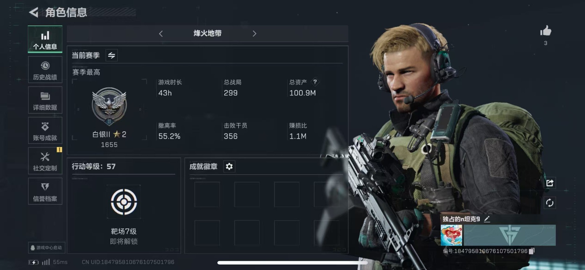 - [11578552]总资产:119.5M 11传说枪械 哈夫币:23.189K 高级安全箱(9.16到期) 可二次 可修改实名 烽火地带段位:黑鹰 全面战场段位:无段位 传说武器皮肤:UZI冲锋枪-特斯拉线圈,M16A4突击步枪-狩猎时刻,AK-12突击步枪-特斯拉线圈,SR-3M紧凑突击步枪-特斯拉线圈,勇士冲锋枪-能天使-午夜邮差,Vector冲锋枪-狩猎时刻,G3战斗步枪-狩猎时刻,复合弓-黑-天际线,725双管霰弹枪-送葬人-无题密令,M4A1突击步枪-阿米娅,CAR-15突击步枪-阿米娅 史诗武器皮肤:QJB201轻机枪-Old Habits,M16A4突击步枪-竞赛选手,M250通用机枪-囚徒,AS Val突击步枪-典狱官,PSG-1射手步枪-无垢,SR-3M紧凑突击步枪-荒野求生,PKM通用机枪-荒野求生,Vector冲锋枪-阿萨拉文明