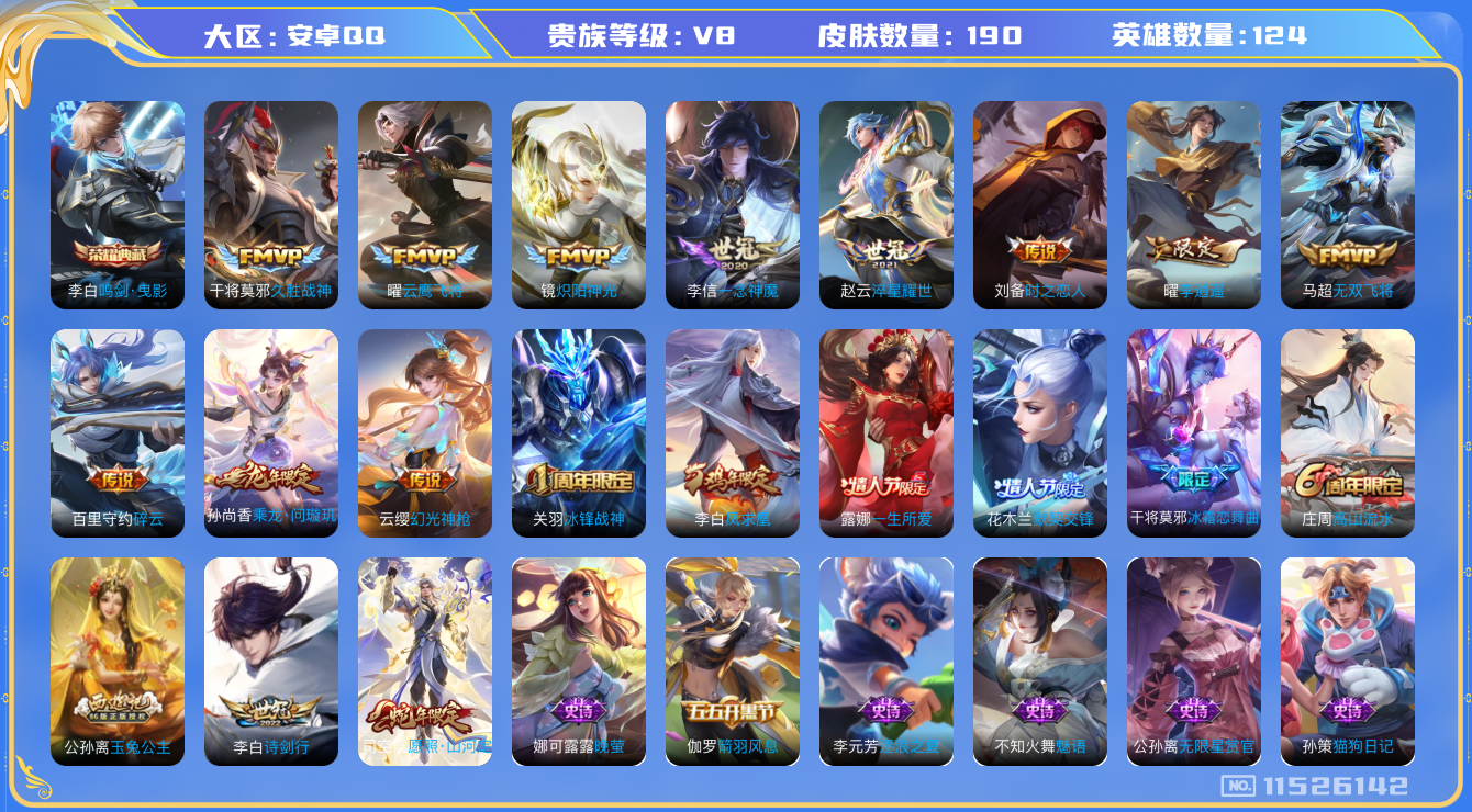 [11526142]李白典藏,司空震蛇年限,久胜,小将军,李逍遥,孙尚香年限,玉兔公主,-可二次-123英雄-190皮肤-1典藏-15传说-57史诗 淬星耀世-赵云 炽阳神光-镜 凤求凰-李白 冰锋战神-关羽 街头霸王-韩信