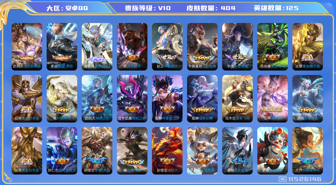 [11526146]V10 2典藏 1无双 32传说 125英雄 404皮肤 典藏英雄武则天 可修改实名 女号 优质装备:倪克斯神谕(宇宙婆娘),鸣剑·曳影,天机白泽,黄金狮子座,黄金射手座,冠军飞将,云鹰飞将(小将军),绛天战甲(鸡嘴战神),黄金白羊座,猫影幻舞,久胜战神,炽阳神光,一念神魔,云霓雀翎,末日机甲-孙尚香(绿蚂蚱),地狱火,仲夏夜之梦(大飞蛾),零号·赤焰,海洋之心,地狱之眼,飞鸢探春,胖达荣荣,游龙清影(小青龙),淬星耀世,超时空战士-狄仁杰,艾琳觅芳踪 珍宝阁皮:优雅恋人,女武神,玩趣恶龙 限定皮:至尊宝,白虎志(电光耗子),凤求凰(白切鸡),凤凰于飞,太华(伽罗年限),梅西,武陵仙君(小桃花),傲雪梅枪,时之彼端,白鹤梁神女,魔法小厨娘,白晶晶,时雨天司(水龙头),神威(电光马子),飞衡(韩信年限),玄嵩(庄周年限),遇见飞天,高山流水,冰锋战神,幽恒(沐浴露),天狼运算者,游园惊梦,梁祝,御风骁将(吕布年限),天狼狩猎者,逐梦之翼,烈魂,岱宗(典韦年限),天狼溯光者,虎魄,天狼征服者,奔雷神使(牛魔年限),祈雪灵祝(雪兔子),天狼绘梦者,李小龙,逐梦之光,朱雀志(守约年限),永曜之星,辉光之辰,霸王别姬-项羽,霸王别姬-虞姬,奇迹圣诞,默契交锋-兰陵王,默契交锋-花木兰,孙行者,猪悟能,大圣娶亲,引擎之心,冰霜恋舞曲,云端筑梦师,蜜橘之夏,热情桑巴,神奇女侠,匿光追影者,女儿国国王,时之祈愿-云中君 史诗皮:龙之律动,百相守梦-周瑜,百相守梦-黄忠,遇见神鹿,紫霞仙子,苍穹之光,电玩小子(小书包),白龙吟,黄金分割率,特工魅影,千年之狐,魅语,高渐离燃音魔法,蒙恬荣光圣徽,无限星赏官,冰冠公主,偶像歌手,白蛇,晚萤,暗夜猫娘,龙骑士(小龙虾),末日机甲-吕布,猫狗日记-孙策,猫狗日记-大乔,时之恋人-孙尚香,乱世虎臣,节奏热浪,修罗,女仆咖啡,摇滚巨星,水果甜心,绅士熊喵,天才门将,星夜王子,心灵骇客,时之奇旅-安琪拉,功夫厨神,德古拉伯爵,暗隐猎兽者,幽灵船长,鬼剑武藏,暗渊魔法,心灵战警,舞动绿茵,地狱岩魂,诗语江南,纤云弄巧,繁星吟游(呼啦呼啦),拒霜思,缤纷独角兽,乘风破浪,逐浪之夏,水晶猎龙者,曙光守护者,箭羽风息,金属风暴,原初追逐者,圣诞狂欢,圣诞恋歌,鹰眼统帅,王者之锤,暗夜贵公子,魅力维加斯,黎明之约,未来纪元-赵云