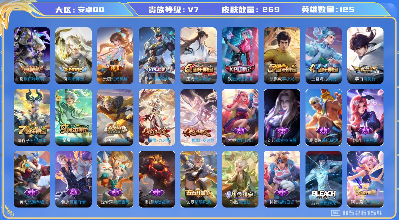 [11526154]V7 1典藏 6传说 125英雄 269皮肤 可修改实名 女号 优质装备:银白咏叹调(倪克斯侍卫),炽阳神光 传说皮:幻光神枪 珍宝阁皮:妄想食味,蔷薇恋人 限定皮:愿照·九州拓(澜年限),愿照·岁时盈(虞姬年限),逐霄战戟,鸣野蒿,高山流水,诗剑行,五谷丰年,梁祝,李小龙,孙行者,匿光追影者 史诗皮:鸭鸭历险记-刘禅,灵蛊蚀心,龙之律动,石田雨龙,茶境仙,怒海争锋,破空之剑,蒙犽顽岩魄,埋骨钱,百相守梦-百里守约,百相守梦-黄忠,紫霞仙子,苍穹之光,黄金分割率,特工魅影,千年之狐,江河有灵,雪夜绮愿(周瑜),百解令(蒙犽),冰冠公主,偶像歌手,电玩·爆裂旋风,末日机甲-吕布,猫狗日记-孙策,猫狗日记-大乔,节奏热浪,女仆咖啡,摇滚巨星,水果甜心,绅士熊喵,天才门将,星夜王子,心灵骇客,功夫厨神,德古拉伯爵,暗隐猎兽者,鬼剑武藏,心灵战警,乐园奇幻夜,天秀·启明,舞动绿茵,地狱岩魂,纤云弄巧,拒霜思,乘风破浪,逐浪之夏,月团寄思,水晶猎龙者,箭羽风息,金属风暴,圣诞狂欢,圣诞恋歌,鹰眼统帅,魅力维加斯,赏金猎手,无心,未来纪元-赵云
