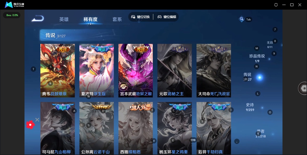 [11526167]V5 1珍品传说 3传说 52英雄 40皮肤 可修改实名 嫦娥大国标 杨玉环小国标 夏洛特小国标 优质装备:器灵·落星盏,地狱之眼,浮生妄 传说皮:典韦战鼓燎原 史诗皮:鸭鸭历险记-刘禅,龙之律动,茶境仙,星夜王子,乘风破浪,鹰眼统帅,魅力维加斯