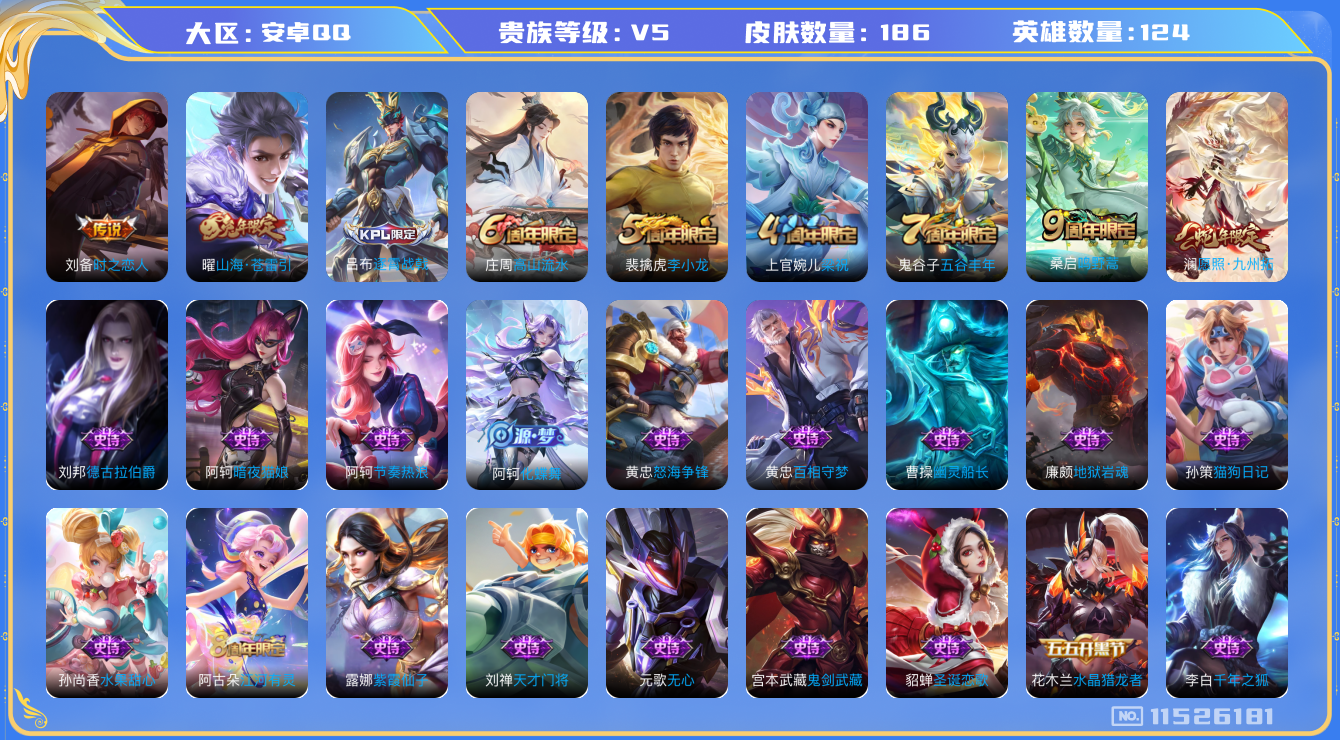 [11526181]V5 4传说 124英雄 186皮肤 可修改实名 优质装备:时之恋人-刘备(电焊工),山海·苍雷引(电光曜子) 珍宝阁皮:胡桃夹子,蔷薇恋人,玩趣恶龙 限定皮:愿照·九州拓(澜年限),逐霄战戟,鸣野蒿,高山流水,五谷丰年,梁祝,李小龙 史诗皮:化蝶舞,灵蛊蚀心,龙之律动,怒海争锋,百相守梦-百里守约,百相守梦-黄忠,紫霞仙子,千年之狐,江河有灵,暗夜猫娘,龙骑士(小龙虾),猫狗日记-孙策,节奏热浪,女仆咖啡,摇滚巨星,水果甜心,天才门将,德古拉伯爵,幽灵船长,鬼剑武藏,心灵战警,天秀·启明,地狱岩魂,纤云弄巧,拒霜思,逐浪之夏,水晶猎龙者,金属风暴,圣诞恋歌,鹰眼统帅,魅力维加斯,无心,未来纪元-赵云