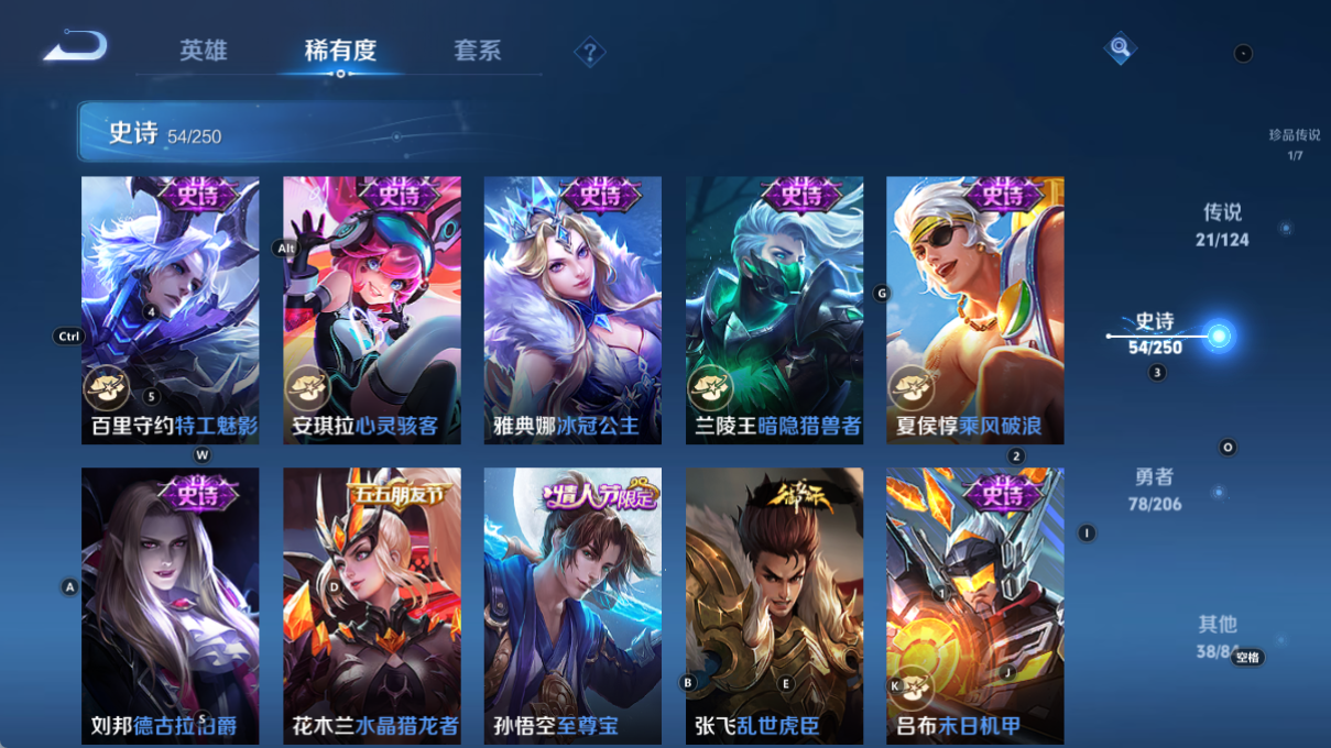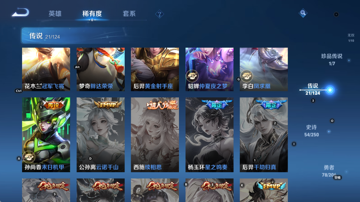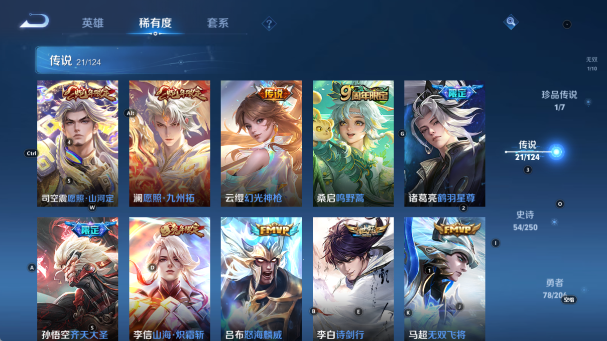 - [11586529]V7 6传说 125英雄 167皮肤 典藏英雄武则天 可修改实名 优质装备:黄金射手座,地狱之眼 传说皮:幻光神枪 珍宝阁皮:优雅恋人 限定皮:愿照·岁时盈(虞姬年限),愿照·山河定(司空震年限),白虎志(电光耗子),遇见飞天,梁祝,李小龙,玄武志(苏烈年限),大圣娶亲 史诗皮:鸭鸭历险记-刘禅,器灵·浮梦炉,龙之律动,东方月初,蔬乡物语(鲁班七号),苍穹之光,永昼,冰冠公主,偶像歌手,晚萤,暗夜猫娘,龙骑士(小龙虾),末日机甲-吕布,乱世虎臣,女仆咖啡,水果甜心,天才门将,功夫厨神,乐园奇幻夜,地狱岩魂,纤云弄巧,繁星吟游(呼啦呼啦),缤纷独角兽,乘风破浪,逐浪之夏,曙光守护者,金属风暴,原初追逐者,圣诞狂欢,圣诞恋歌,鹰眼统帅,暗夜贵公子,魅力维加斯,黎明之约