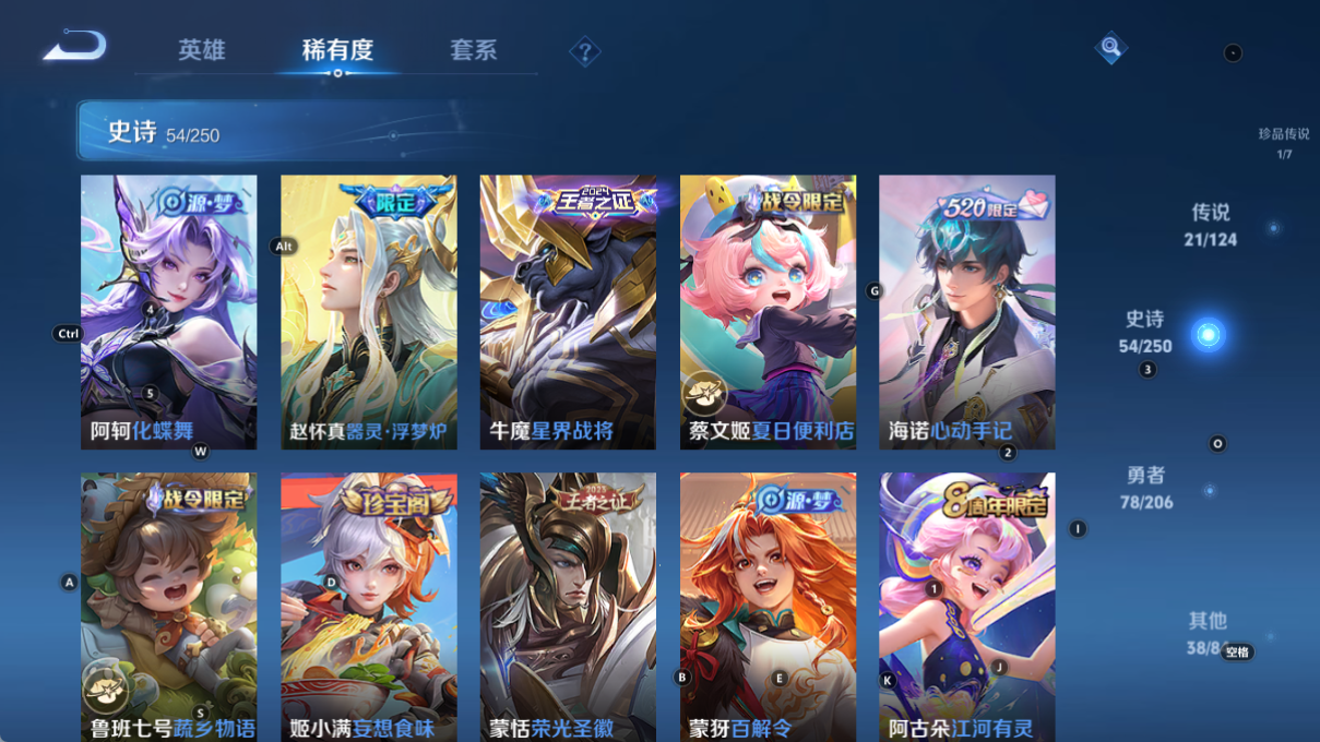 - [11445831]V8 1典藏 19传说 124英雄 298皮肤 可修改实名 优质装备:鸣剑·曳影,黄金狮子座,云鹰飞将(小将军),久胜战神,炽阳神光,一念神魔,末日机甲-孙尚香(绿蚂蚱),地狱火,地狱之眼,无双飞将,燃星之曲,遇见神鼓 传说皮:落雪白狼,幻光神枪 珍宝阁皮:女武神,玩趣恶龙 限定皮:愿照·九州拓(澜年限),愿照·岁时盈(虞姬年限),愿照·众生和(妲己年限),凤求凰(白切鸡),傲雪梅枪,时之彼端,白晶晶,遇见飞天,高山流水,齐天大圣,五谷丰年,梁祝,天狼绘梦者,李小龙,辉光之辰,霸王别姬-虞姬,圣诞老人,真爱至上,纯白花嫁,大圣娶亲,寅虎·御盾(廉颇年限) 史诗皮:鸭鸭历险记-刘禅,苍鳞隐世,器灵·浮梦炉,糖绘人间,化蝶舞,星界战将,龙之律动,藏狐·褐绒,百相守梦-黄忠,紫霞仙子,白龙吟,黄金分割率,特工魅影,千年之狐,永昼,江河有灵,偶像歌手,暗夜猫娘,晚萤,冰冠公主,猫狗日记-孙策,猫狗日记-大乔,乱世虎臣,修罗,女仆咖啡,摇滚巨星,水果甜心,天才门将,星夜王子,心灵骇客,功夫厨神,德古拉伯爵,暗隐猎兽者,幽灵船长,鬼剑武藏,心灵战警,天秀·启明,地狱岩魂,纤云弄巧,繁星吟游(呼啦呼啦),缤纷独角兽,乘风破浪,水晶猎龙者,曙光守护者,箭羽风息,金属风暴,原初追逐者,圣诞狂欢,圣诞恋歌,鹰眼统帅,王者之锤,暗夜贵公子,魅力维加斯,黎明之约,寅虎·御盾,无心,未来纪元-赵云